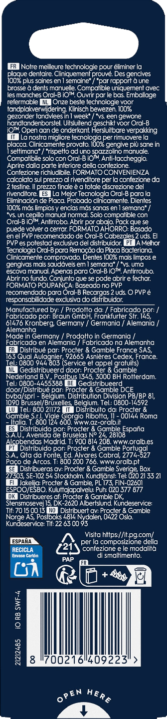 Oral-B iO Series Gentle Care -vaihtoharjojen tehokkaat mutta hellävaraiset mikrovärähdykset sekä ainutlaatuinen, hammaslääkärien innoittama pyöreä harjaspää takaavat ammattimaisen puhtauden tunteen joka päivä. Erityisesti Oral-B iO -sähköhammasharjan varsia varten suunnitellut Gentle Care -harjaspäät auttavat poistamaan jopa 100 % enemmän plakkia kuin tavallinen käsikäyttöinen hammasharja ja tekevät hampaista puhtaan tuntuiset ja hohtavat. Gentle Care -harjaspäässä on jopa 4 000 pehmeää harjasta ja vaimentava ulkokehä, joka mukautuu tarkasti hampaiden kaarevuuteen ja suojaa ikeniä. Hammaslääkärit suosittelevat vaihtamaan harjaspään 3 kuukauden välein parhaiden tulosten saavuttamiseksi, joten Oral-B-vaihtoharjojen väriä vaihtavat harjakset osoittavat, kun harjaspää on aika vaihtaa uuteen. Nauti ylivoimaisesta puhdistustehosta ainoilla vaihtoharjoilla, jotka on suunniteltu yksinomaan Oral-B iO -sähköhammasharjaa varten ja jotka ovat taatusti yhteensopivia.