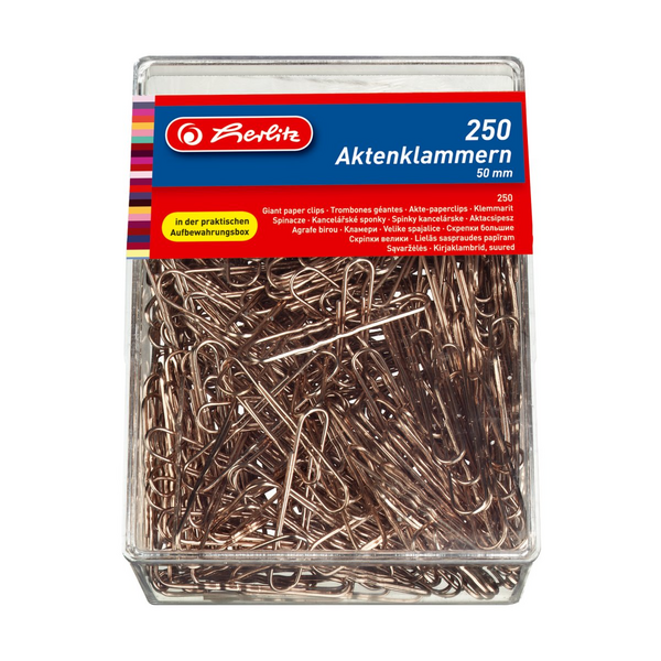 250 kappaletta kuparoituja paperiliittimiä, eli klemmareita. Klemmarin pituus on 50 mm. Tuote myydään kätevässä kovamuovisessa säilytysrasiassa, jossa klemmarit on helppo säilyttää.