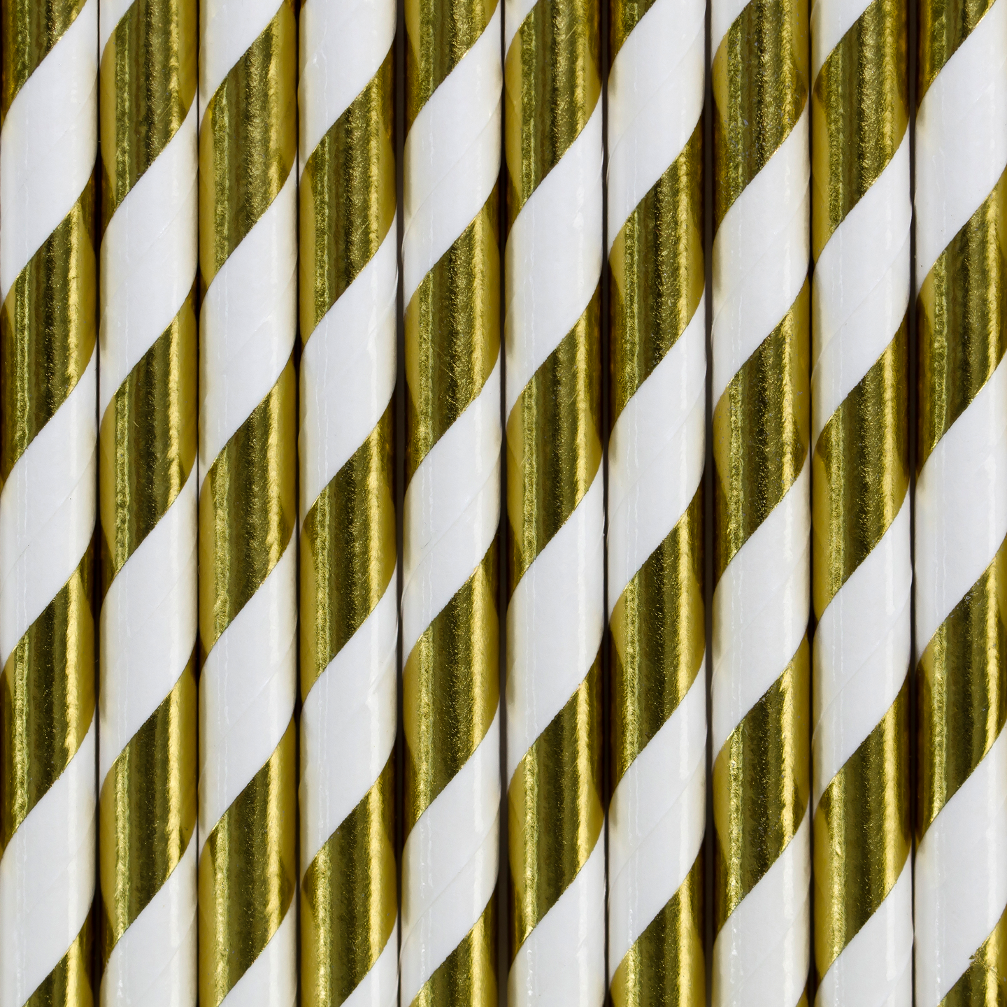 Valko-kulta raidalliset pahvijuomapillit sopivat arkeen ja juhlaan! Paketissa 10 kappaletta. Pillien korkeus n. 19,5 cm ja leveys n. 0,5 cm.