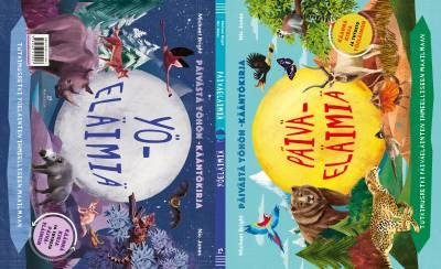 Tervetuloa maailmanympärysmatkalle päivä- ja yöeläinten pariin! Kekseliäs kääntökirja on täydellinen tapa tutustua eläinmaailman tapoihin. Värikkäästi kuvitetut aukeamat esittelevät kaksitoista aluetta, joista jokaiseen tutustutaan sekä päivänvalossa että yön pimeinä tunteina. Jotkut lajit näkevät erinomaisesti pimeässä, joillekin päivänvalo sopii parhaiten. Päivisin arapapukaijat lentelevät Etelä-Amerikan sademetsissä, ja öisin samoilla alueilla liikkuu jaguaari. Afrikan savannien armoton aurinko saa päiväeläimet hakeutumaan levolle. Kun paahde taittuu yöllä ihanaan viileyteen, pensassarvikuonot kokoontuvat juomapaikoille. Madagaskar taas on makien valtakuntaa. Rengashäntämakit käyvät ”hajutappeluita” reviireistään päiväsaikaan, öisin ai-ai tutkii onttoja puita ja noukkii herkullisia toukkia superpitkillä sormillaan suihinsa. Moni laji on vaarassa kirkkaassa päivänvalossa, sillä saalistajien on helppo nähdä ne, mutta yön pimeydessä on turvallista etsiä ravintoa ja tutustua lajitovereihin. Myös aamu- ja iltahämärässä kuhisee: joillekin linnuille aikainen aamu on oivallinen hetki laulaa ja houkutella paikalle lajitovereita. Mutta mitä tapahtuu, kun yöeläimen suurin vihollinen liikkuu myös yöaikaan?