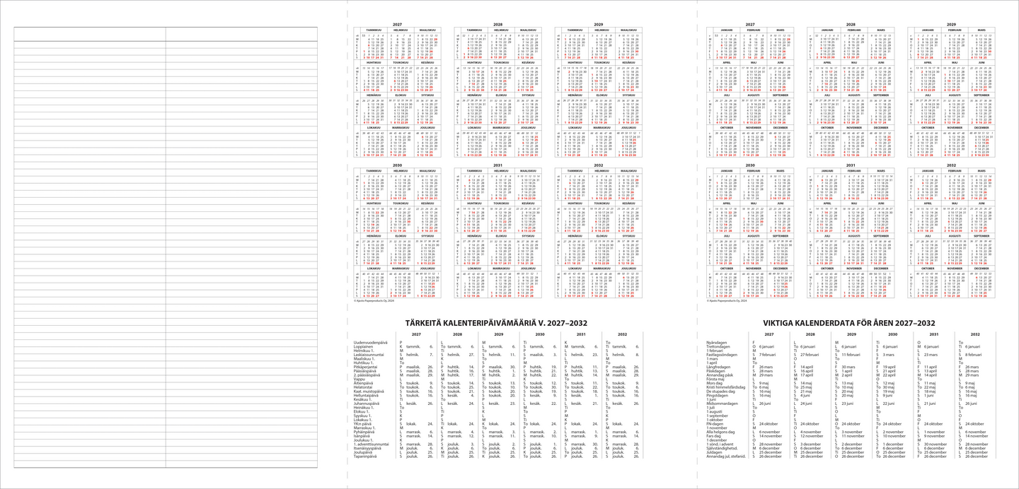 Suomen suosituin ajanvarauskirja jo melkein 80 vuotta. Koko 210 x 297 mm (A4); parikierresidottu; kielisyys: suomi, ruotsi; päiväkirja 49/2025–1/2027; vuosisuunnitelmat 2026–2028; kansalliset vapaapäivät päiväkirjan sivuilla ja luettelona; taulukkoalmanakka vuosille 2027–2032 ja luettelo näiden vuosien tärkeistä päivistä; suomalaiset ja suomenruotsalaiset nimipäivät; takana esiintaitettava vuoden 2026 taulukkokalenteri; Suomen kartta; FSC®-sertifioitu tuote.