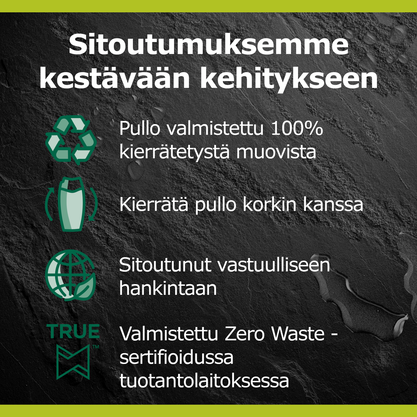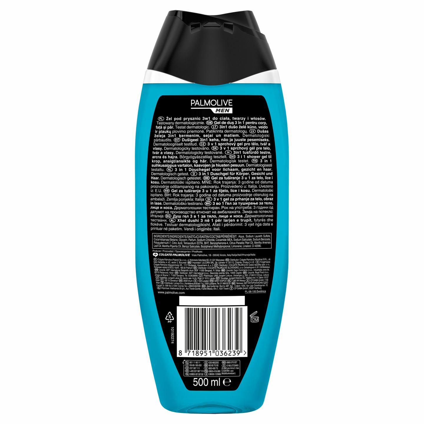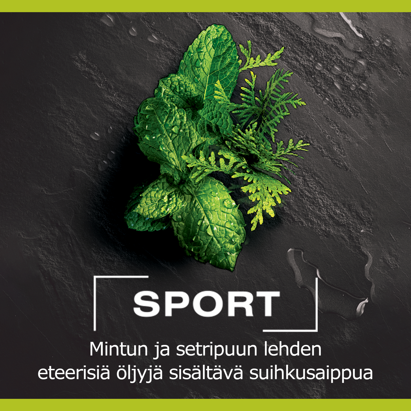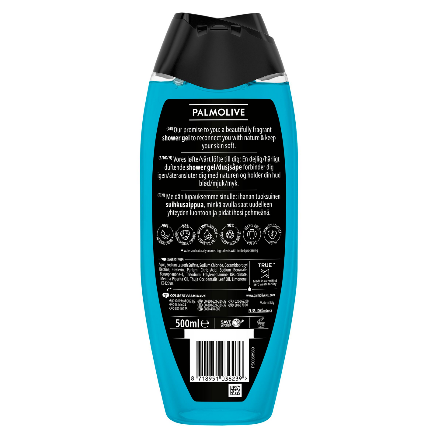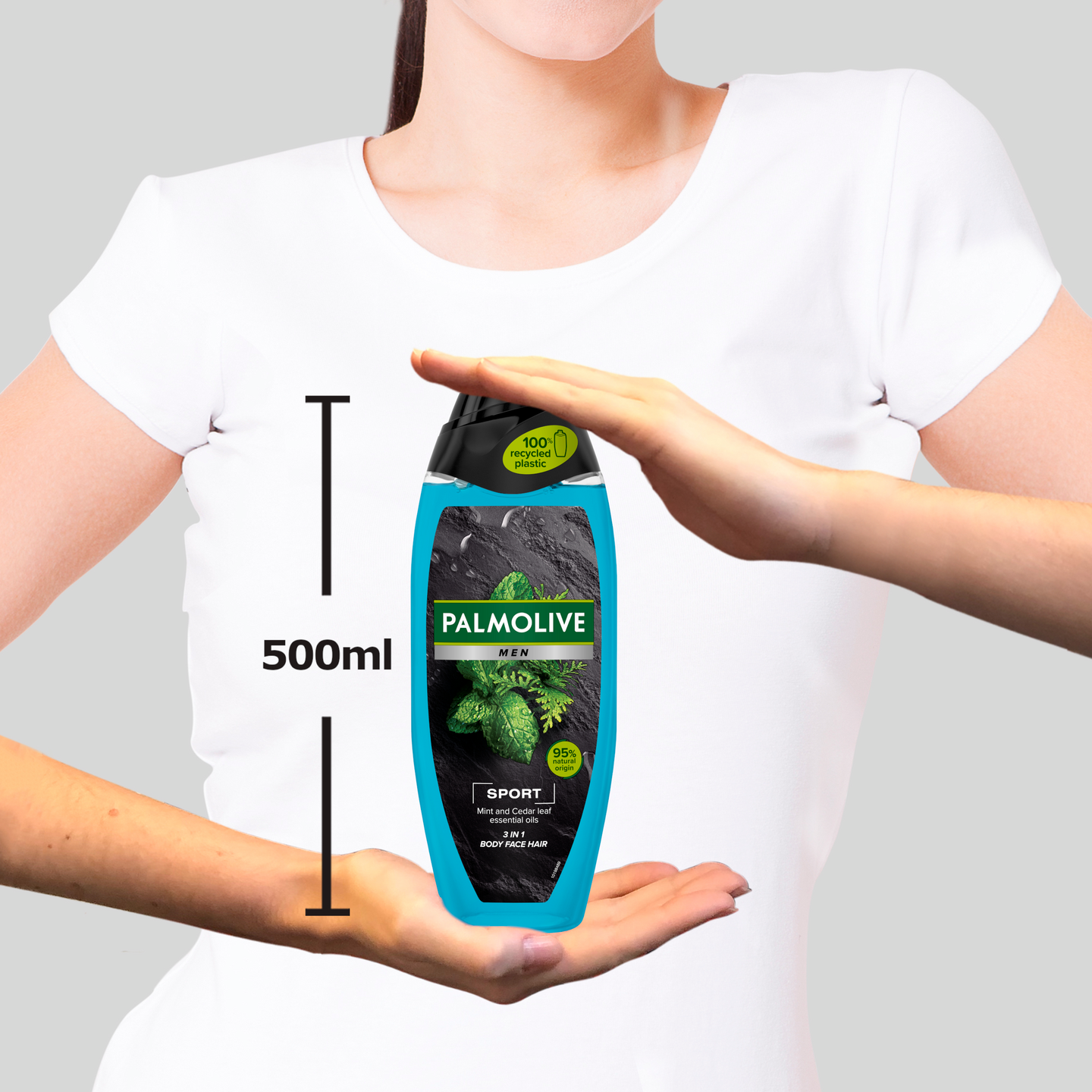 Koe piristävä suihkukokemus käyttämällä Palmolive Men 3-in-1 Sport-suihkusaippuaa. Vegaaninen miesten suihkusaippuamme on luonnon inspiroima, ja sen koostumus on 94% luonnollista alkuperää ja 95% luonnollisia ainesosia sisältävä. Se saa raikkaan tuoksunsa mintusta ja setripuun lehtiöljystä, ja myös sisältää 100% luonnollisia eteerisiä öljyjä tekemään suihkuhetkestä mahdollisimman piristävän kokemuksen. Voit käyttää 3-in-1 -suihkusaippuaa kätevästi vartalon, kasvojen sekä hiusten tehokkaaseen pesemiseen. Tuotteen koostumus on dermatologisesti testattu ja pH-neutraali. Olemme sitoutuneet luonnon hyvinvointiin, kestävään kehitykseen ja vastuulliseen hankintaan** ja siksi suihkusaippuamme koostumus on 95% biohajoava ja sen pullo on tehty 100% kierrätetystä muovista jonka voit myös uudelleen kierrättää. *Vesi ja luonnollisesti hankitut raaka-aineet, joita on käsitelty mahdollisimman vähän. **www.colgatepalmolive.com/committed-to-responsible-sourcing