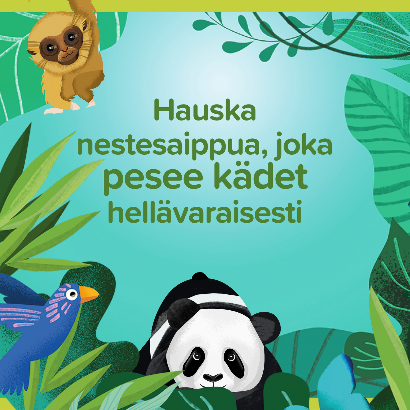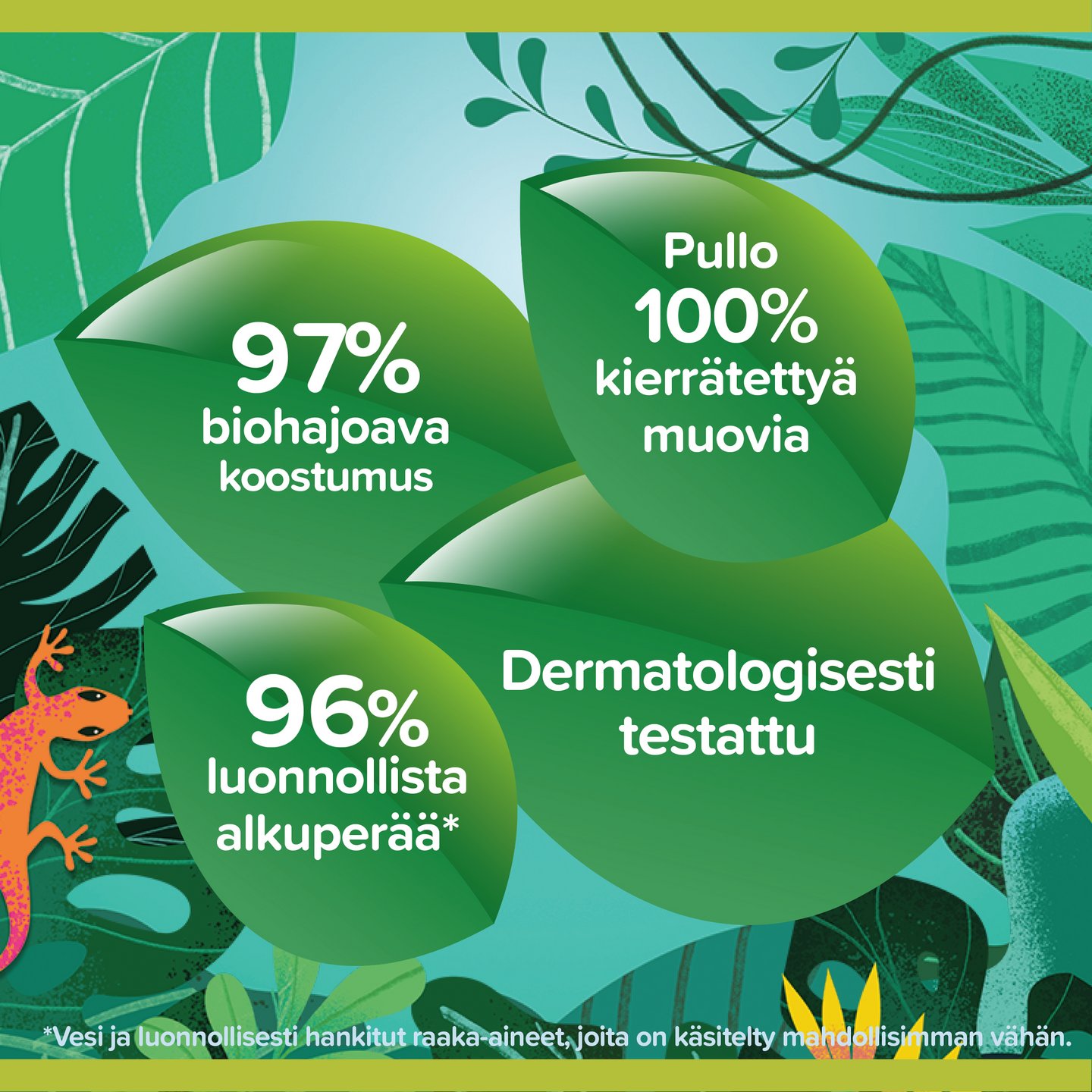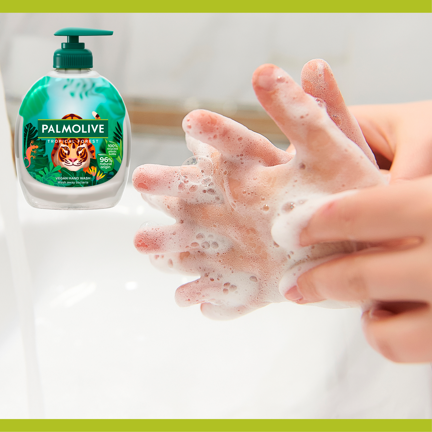 Lähde tutkimusmatkalle viidakkoon! Ihastuttavan tuoksuinen Palmolive Tropical Forest -nestesaippua pesee kädet hellävaraisen tehokkaasti. Hauskan viidakkosaippuamme pullo on valmistettu kierrätetystä muovista, ja voi myös uudelleen kierrättää. Nestesaippuan koostumus on 96% luonnollista alkuperää olevista ainesosista* ja 97% biohajoava. *Vesi ja luonnollisesti hankitut raaka-aineet, joita on käsitelty mahdollisimman vähän.