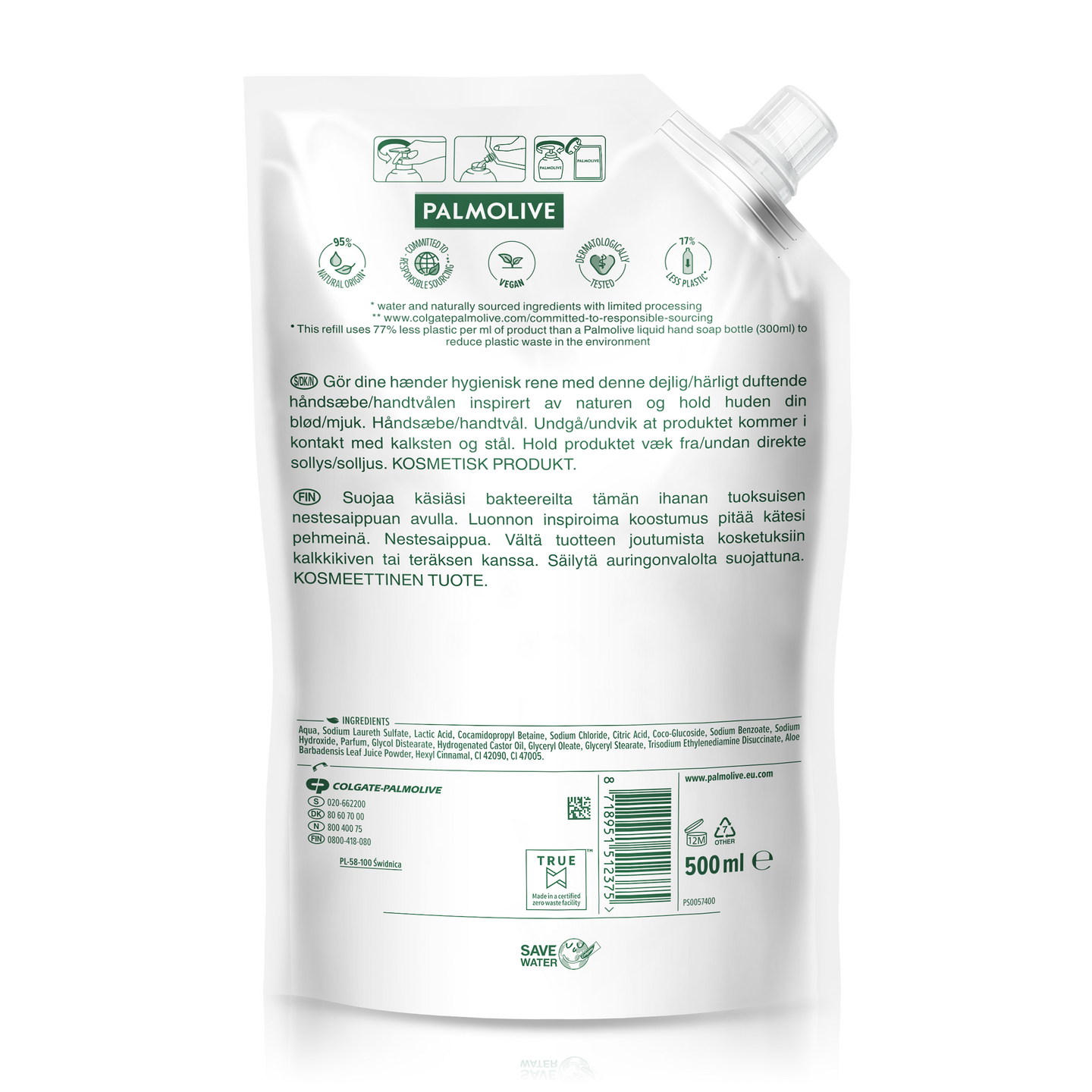 Vegaaninen Palmolive Hygiene Plus Sensitive -nestesaippua puhdistaa kätesi hellävaraisesti ja tehokkaasti. Saippuan sisältämä aloe vera -uute jättää käsiisi miellyttävän tuoksun ja pitää ihosi pehmeämpänä. Palmolive Hygiene Plus Sensitive -käsisaippuan luonnollinen antibakteerinen ainesosa pitää kätesi suojattuina. Valmistettu 95% luonnollisista ainesosista* ja sen koostumus on 98% biohajoava. Dermatologisesti testattu. Käyttämällä täyttöpussia autat vähentämään muovijätteen määrää.