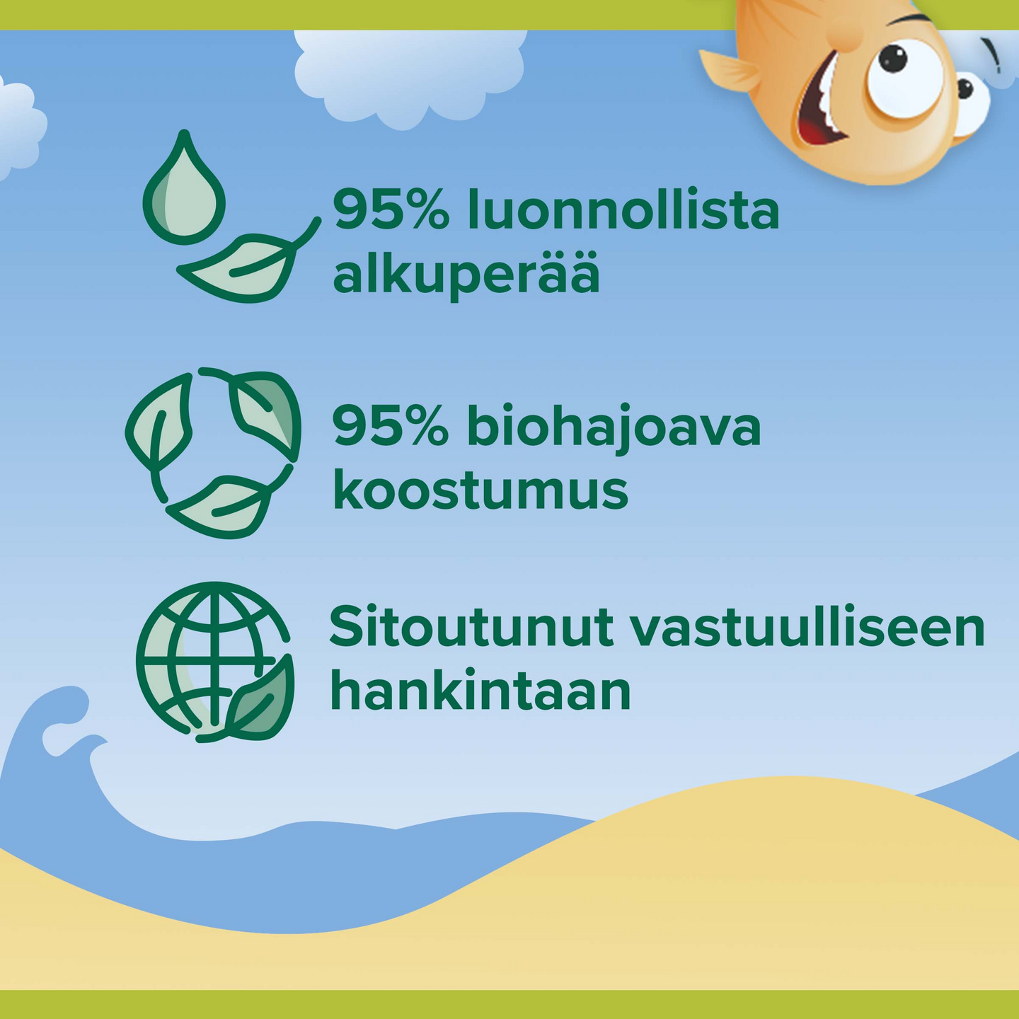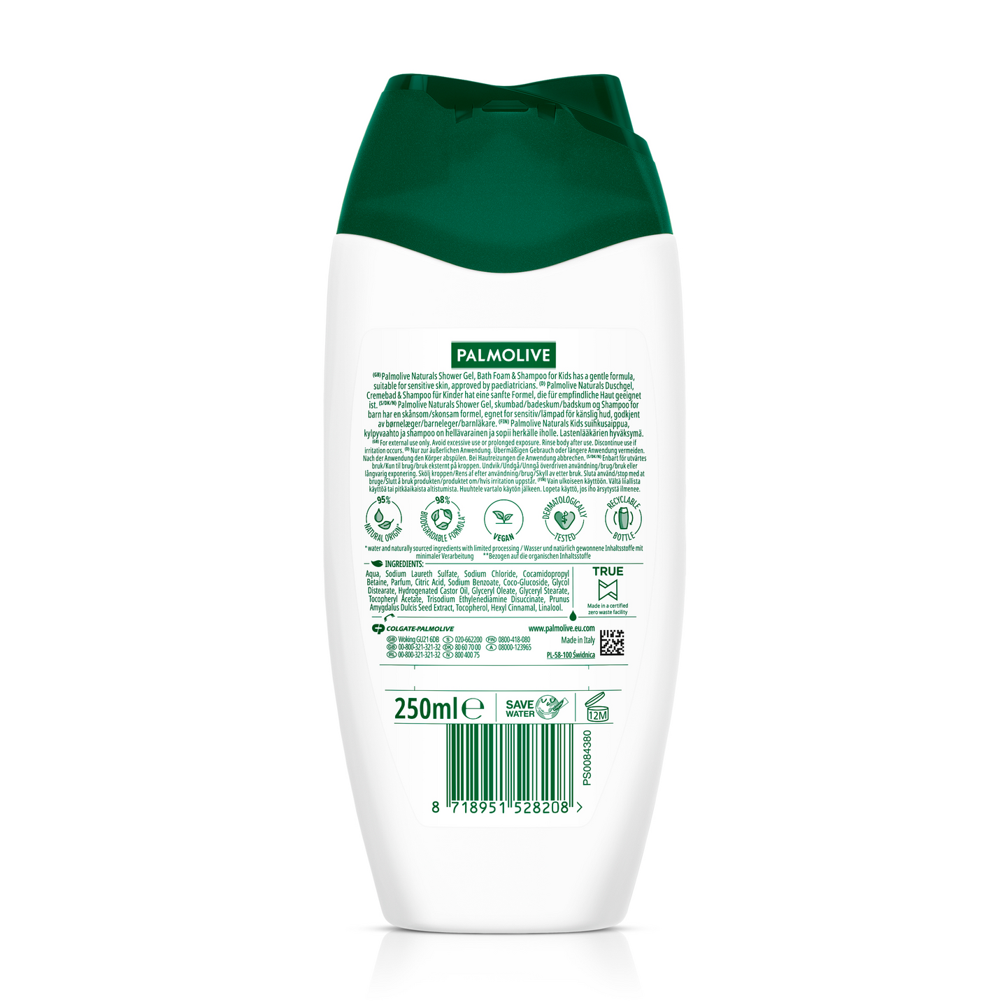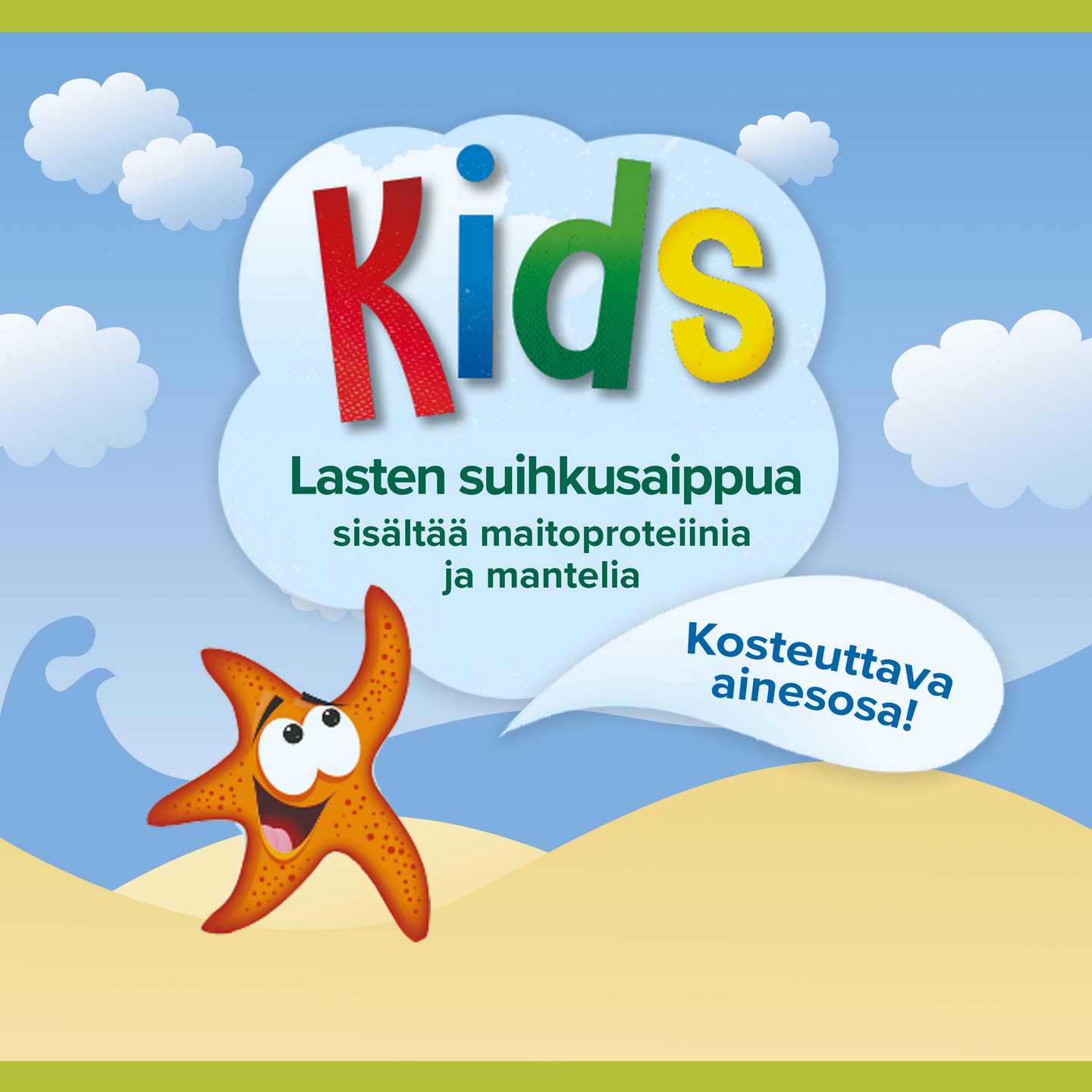 Palmolive Naturals Kids -suikusaippuan hellävarainen koostumus sopii herkälle iholle ja on lastenlääkärien hyväksymä. Sen luonnon inspiroima koostumus on 98% biohajoava ja sisältää 95% luonnollista alkuperää* olevia ainesosia. Sisältää manteliperäistä maitoa ja tuoksuu miedolta mantelilta. Kierrätettävä pullo ja korkki. Neljä hauskaa eläinkuosia. *Vesi ja luonnollisesti hankitut raaka-aineet, joita on käsitelty mahdollisimman vähän.