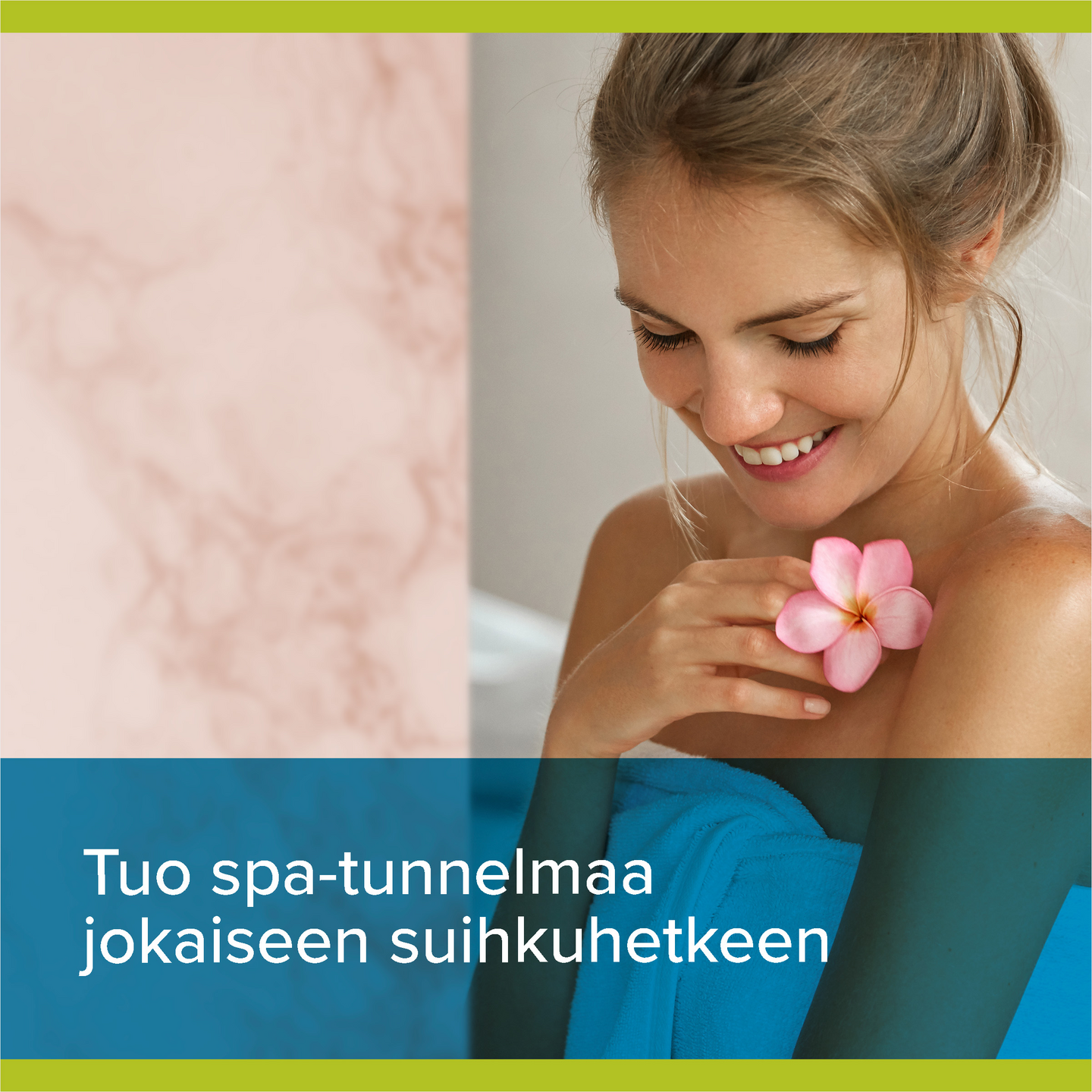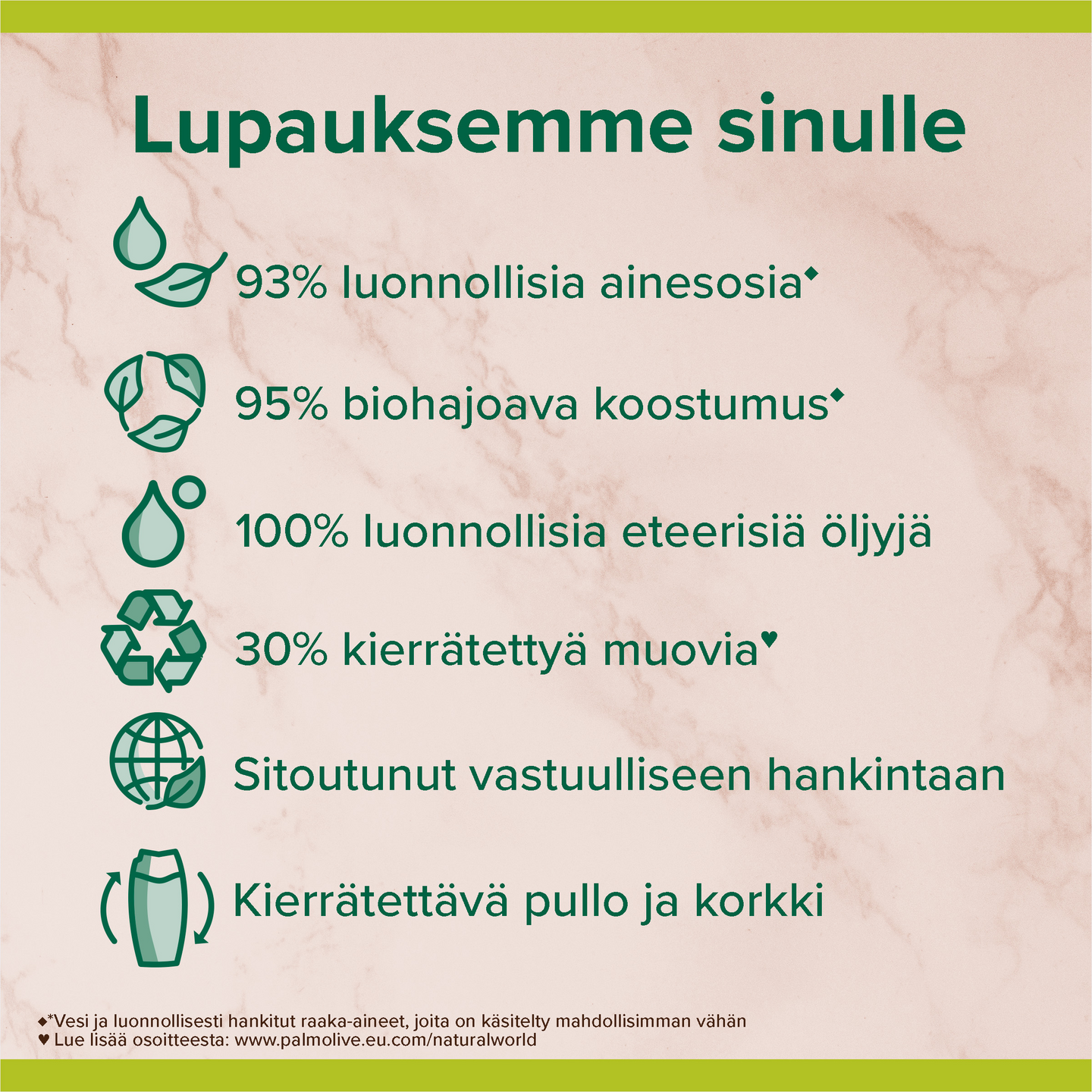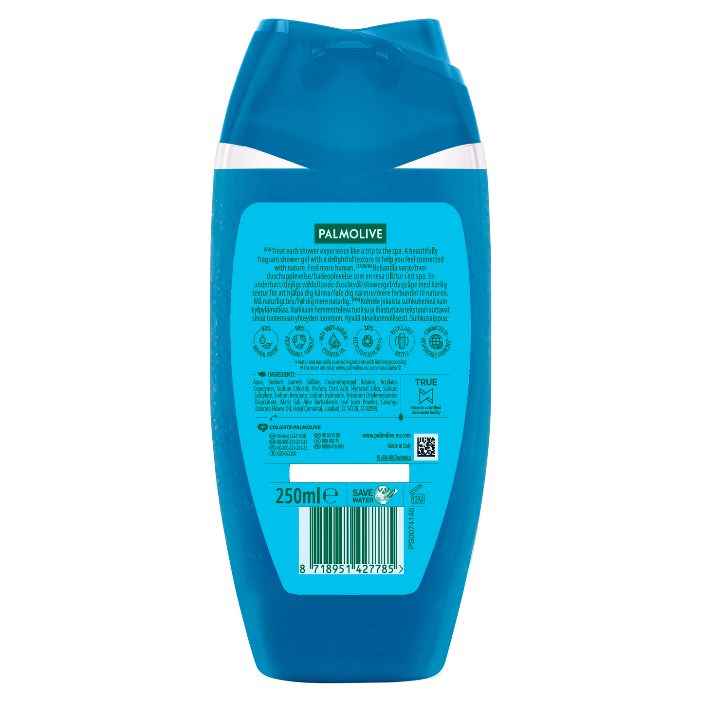 Tee suihkuhetkestä hemmotteleva spa-hetki Palmolive Thermal Spa Mineral Massage -suihkusaippuan avulla, joka sisältää merisuolaa ja aloe veraa. Sen ihastuttava tuoksu ja tekstuuri auttavan sinua lähemmäs luontoa. Suihkusaippua sisältää 93% luonnollisia ainesosia* ja sen koostumus on 98% biohajoava. Sisältää 100% luonnollisia eteerisiä öljyjä, jotka tekevät suihkukokemuksestasi erityisen hemmottelevan. *Vesi ja luonnollisesti hankitut raaka-aineet, joita on käsitelty mahdollisimman vähän.