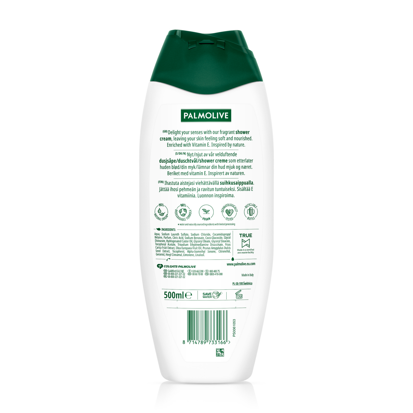 Tee jokaisesta suihkuhetkestä ihoa ravitseva ja ihanan tuoksuinen kokemus peseytymällä Palmolive Naturals Olive & Milk -suihkusaippualla. Tämä luonnon inspiroima suihkusaippua sisältää mantelimaitoa ja ilahduttaa aistejasi ravitsevalla, kermaisella koostumuksella sekä tuoreen oliivin ja kukkien raikaalla tuoksulla. Sen uusi, paranneltu* koostumus sisältää E-vitamiinia, ja jättää ihosi pehmeän tuntuiseksi jokaisen suihkun jälkeen. Vegaaninen Palmolive Naturals Olive & Milk -koostumus sisältää kasvipohjaista maitoa. Se on valmistettu 95% luonnollisista ainesosista** ja on 98% biohajoava. Kierrätettävä pullo ja korkki, sekä dermatologisesti testattu koostumus. *Biohajoavuus nyt 98%. **Vesi ja luonnollisesti hankitut raaka-aineet, joita on käsitelty mahdollisimman vähän.