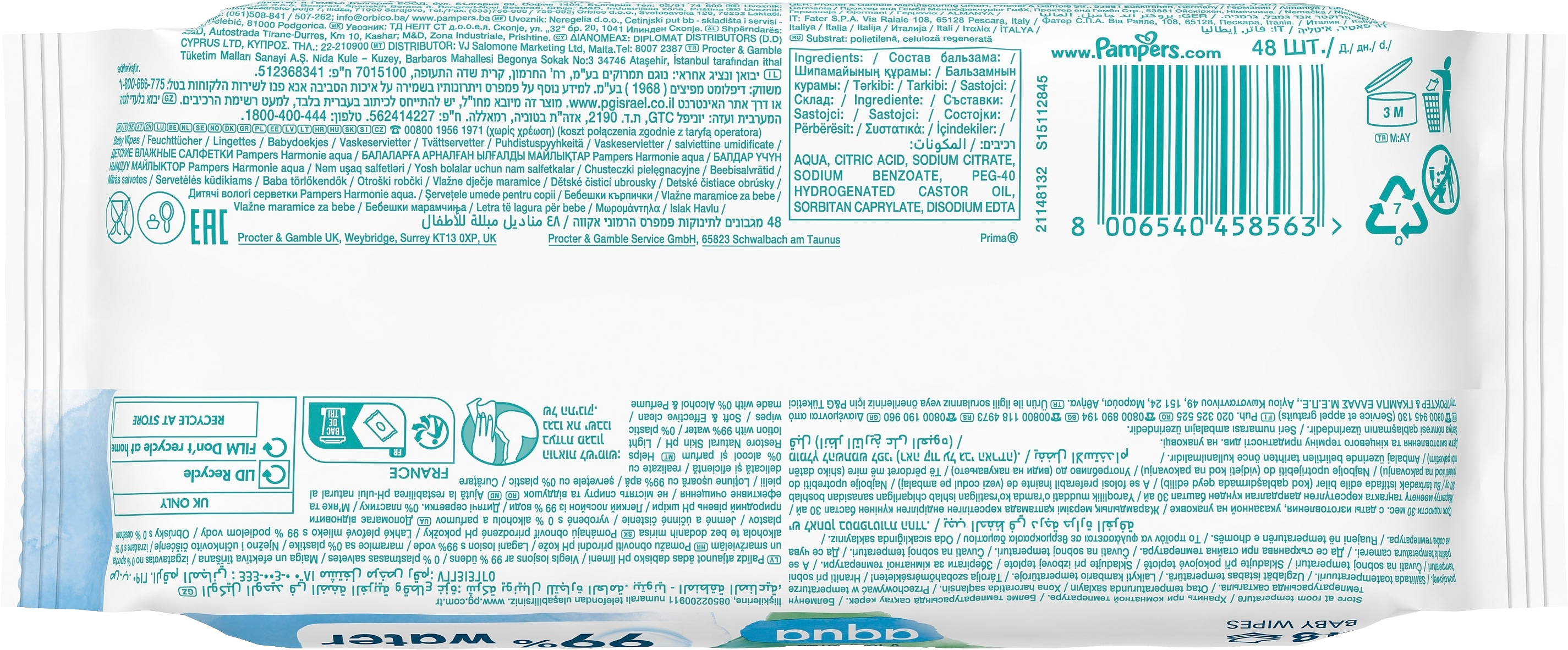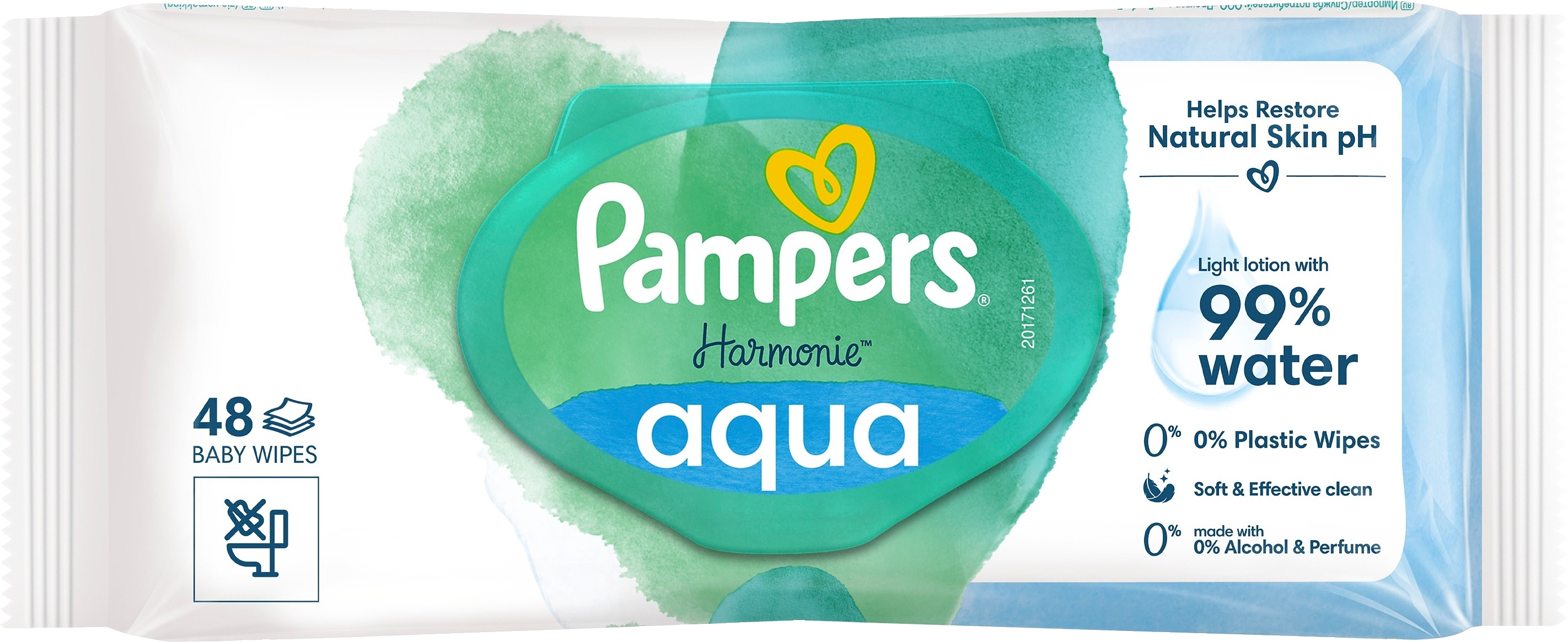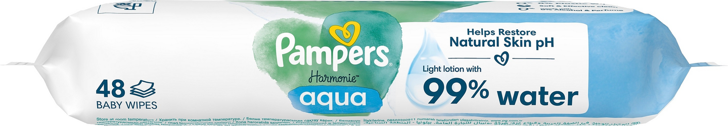 Hellävaraista hoitoa ja suojaa vauvan kallisarvoiselle iholle – sisältää 99 % vettä. Pampers Harmonie Aqua -puhdistuspyyhkeet ovat hellävaraisempia kuin vain puuvilla ja vesi. Ainutlaatuisen koostumuksensa ansiosta hellävaraiset ihoa puhdistavat ja suojaavat ainesosat auttavat palauttamaan ihon luonnollisen pH-arvon ja ehkäisemään ihoärsytystä. Ne sisältävät 0 % alkoholia tai hajusteita ja ne on valmistettu 100 % kasvipohjaisista kuiduista, joista 10 % on ensiluokkaista puuvillaa. Koostumus on dermatologisesti testattu ja Skin Health Alliancen dermatologien hyväksymä. Se on testattu epäpuhtauksien varalta OEKO-TEX Standard 100 -standardin mukaisesti.