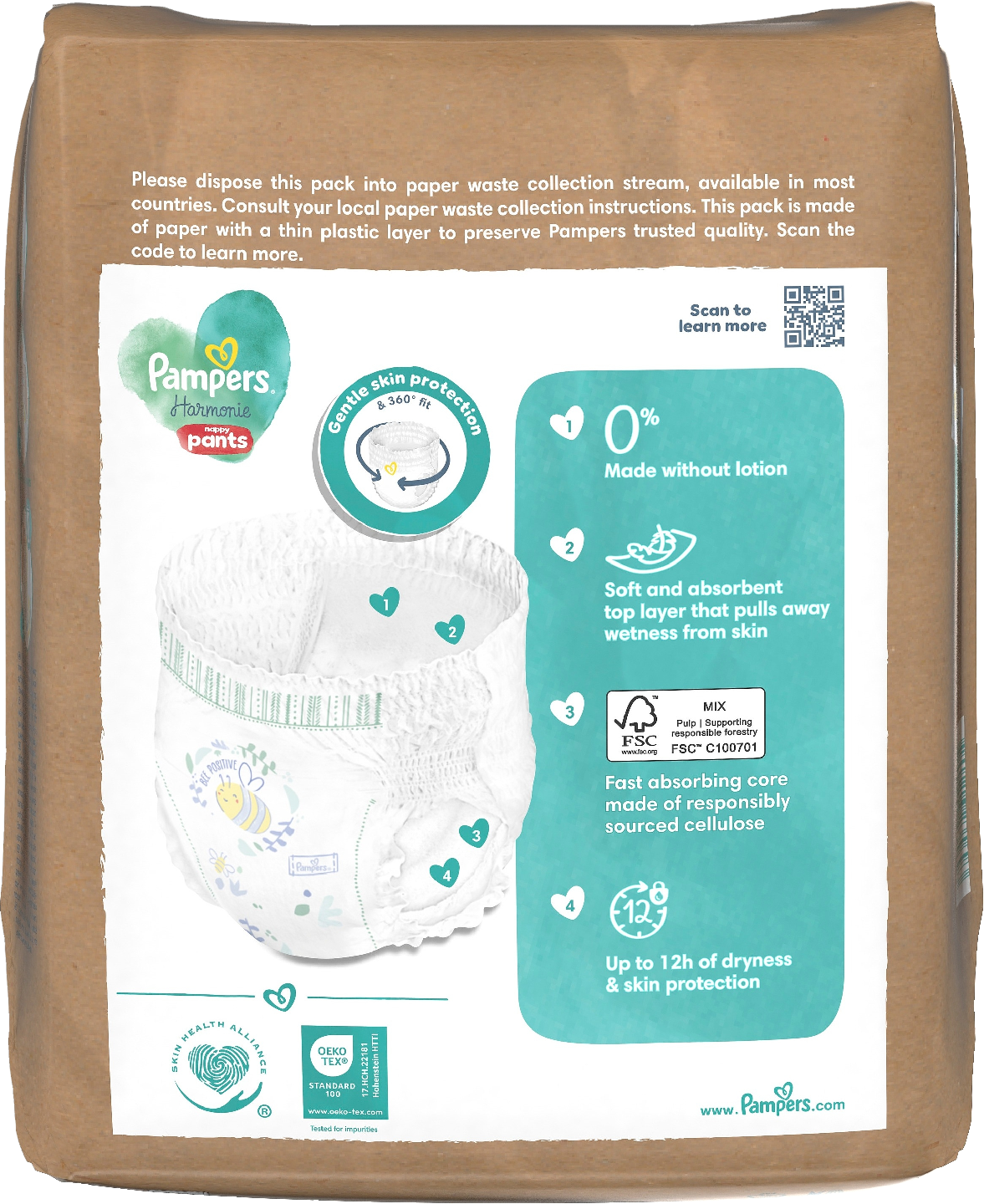 Hellävarainen ihonsuoja ja 360° Comfort Fit. Pampers Harmonie Pants -housuvaipat ovat hellävaraisia vauvan iholle. Ne ovat hypoallergeenisia¹, dermatologisesti testattuja ja sisältävät 0 % voiteita. Lisäksi ne ovat OEKO-TEX Standard 100 -sertifioituja ja Skin Health Alliancen dermatologien* hyväksymiä. Ne on valmistettu FSC-sertifioidusta selluloosasta ja muista huolella valituista materiaaleista. Ne takaavat jopa 12 tunnin Pampers-kuivuuden, mikä takaa korkean laadun jokaiselle vanhemmalle. Pampers Harmonie Pants -housuvaippa on helppo vaihtaa myös lapsen kiemurrellessa. Joustavan vyötärönauhan ansiosta se on helppo pukea päälle yhdellä vedolla. Riisu ja hävitä vaippa helposti: repäise sivut auki, kääri rullalle ja kiinnitä teipillä. Pampers Harmonie -housuvaipoissa on uudet suloiset painatukset ja kätevä Pampers-virtsanilmaisin: sinä ja vauvasi tulette ihastumaan niihin! Haluatko tietää lisää Pampersin käyttämistä materiaaleista? Käy osoitteessa pampers.fi *SHA® hyväksyy Pampers®-vaipat turvallisiksi kosketuksissa vauvan ihon kanssa. Lue lisää osoitteesta pampers.com