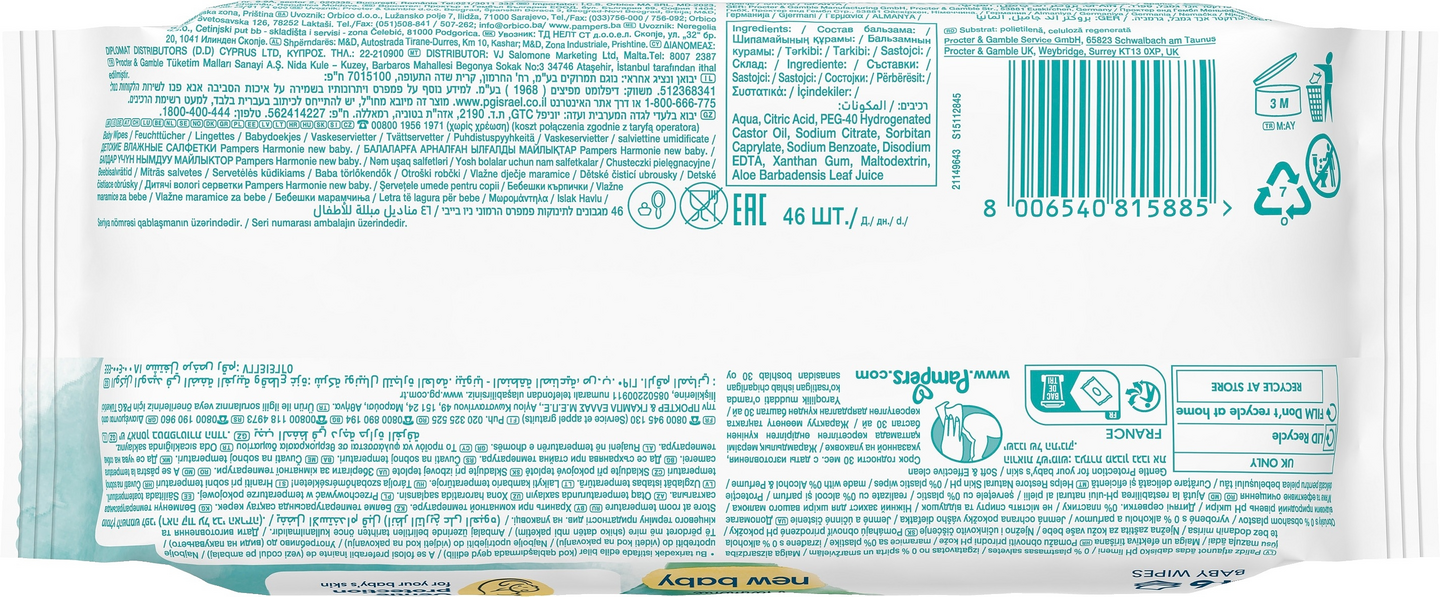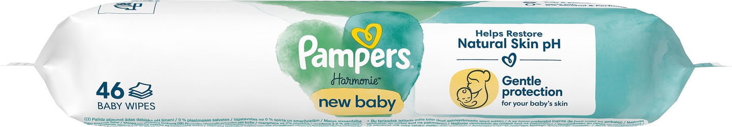 Hellävaraista hoitoa ja suojaa vauvan kalliasrvoiselle iholle – sisältää ripauksen aloe veraa. Pampers Harmonie NewBaby -puhdistuspyyhkeet ovat hellävaraisempia kuin vain puuvilla ja vesi. Ainutlaatuisen koostumuksensa ansiosta hellävaraiset ihoa puhdistavat ja suojaavat ainesosat auttavat palauttamaan ihon luonnollisen pH-arvon ja ehkäisemään ihoärsytystä. Ne sisältävät 0 % alkoholia tai hajusteita ja ne on valmistettu 100 % kasvipohjaisista kuiduista, joista 10 % on ensiluokkaista puuvillaa. Koostumus on dermatologisesti testattu ja Skin Health Alliancen dermatologien hyväksymä. Se on testattu epäpuhtauksien varalta OEKO-TEX Standard 100 -standardin mukaisesti.