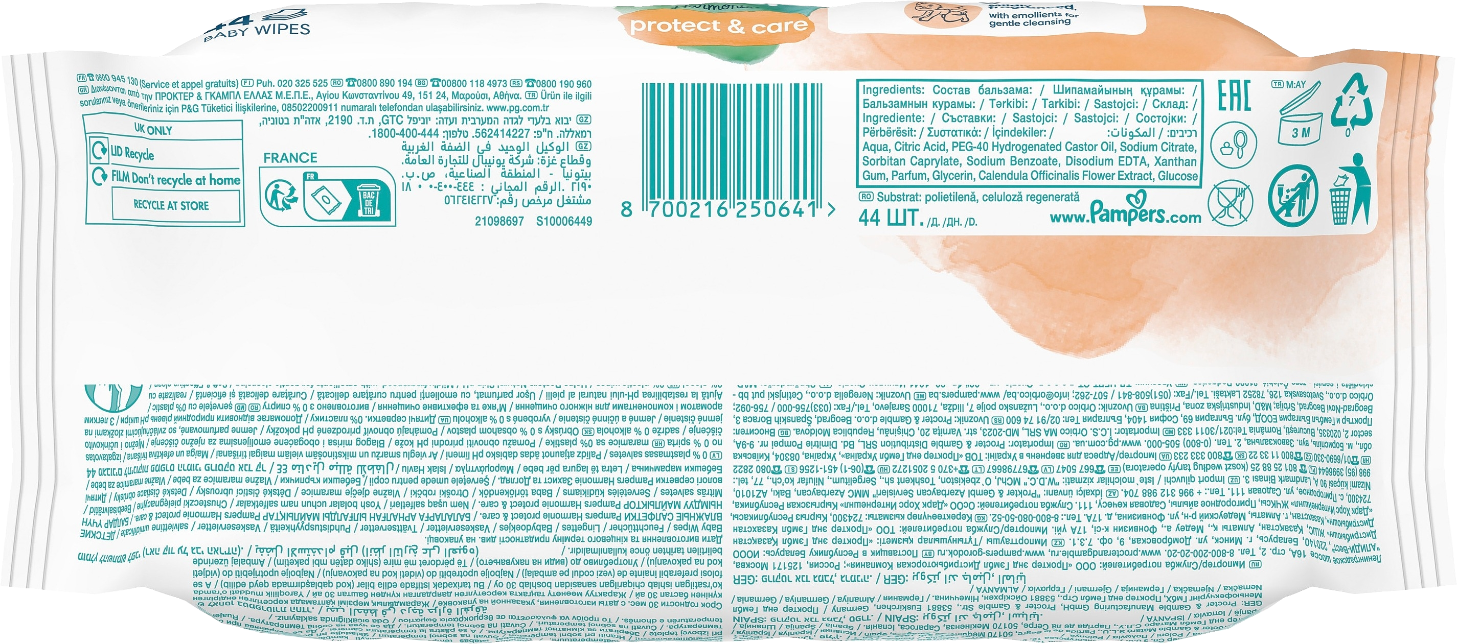 Hellävaraista hoitoa ja suojaa vauvan kallisarvoiselle iholle – sisältää ripauksen kehäkukkaa. Pampers Harmonie Protect&Care -puhdistuspyyhkeet ovat hellävaraisempia kuin vain puuvilla ja vesi. Ainutlaatuisen koostumuksensa ansiosta hellävaraiset ihoa puhdistavat ja suojaavat ainesosat auttavat palauttamaan ihon luonnollisen pH-arvon ja ehkäisemään ihoärsytystä. Ne sisältävät 0 % alkoholia ja ne on valmistettu 100 % kasvipohjaisista kuiduista, joista 10 % on ensiluokkaista puuvillaa. Koostumus on dermatologisesti testattu ja Skin Health Alliancen dermatologien hyväksymä.