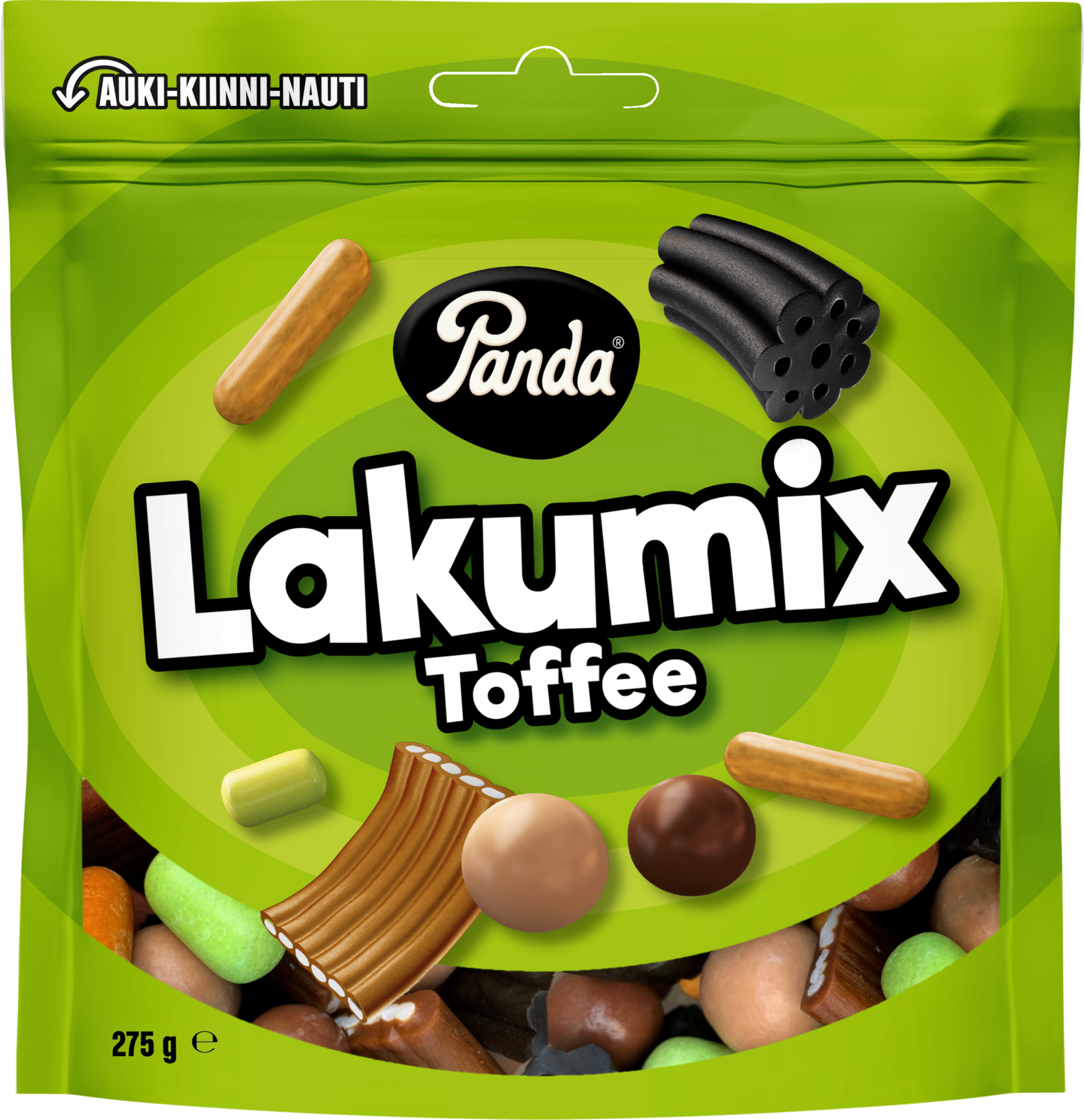 Panda Lakumix uutuus on toffeen ja lakritsin voittamaton yhdistelmä! Mixistä löytyy toffeeta ja lakua kuudessa jännittävässä muodossa ¬– jokaiselle toffeen ja lakun ystävälle takuulla jotakin. On toffeelakritsi raepuikkoja, täytelaattoja, omenarakeita ja suklaapalloja, salty caramel lakritsisuklaapalloja ja tietysti perinteisiä mustia lakupaloja.