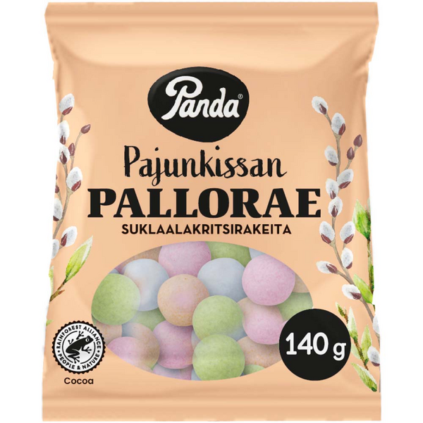 Panda Pajunkissan pallorae on keväisen raikas ja värikäs sekoitus pääsiäiseen sopivia pallorakeita. Pussista löytyy 4 erimakuista suklaalakritsipalloa, joissa rapsahtava raekuoren ja suussa sulavan suklaakerroksen alta paljastuu pehmeä lakritsisydän. Makuina: Mansikka, Minttu, Lime ja Mango. Pallorakeet soveltuvat täydellisesti niin leivontaan, koristeluun kuin herkutteluun.