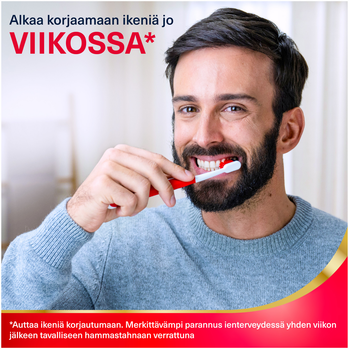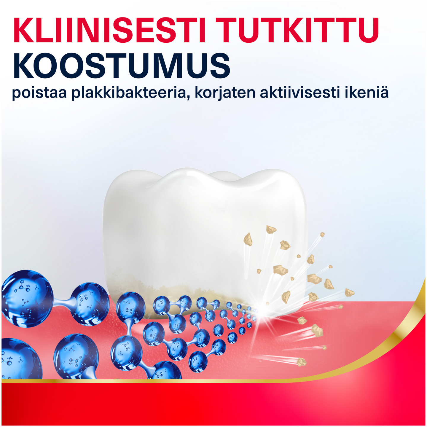 "Parodontax Active Gum Repair -hammastahna auttaa aktiivisesti korjaamaan verta vuotavia, turvonneita & tulehtuneita ikeniä jo viikossa.* Se auttaa korjaamaan aikaisia ienongelmia torjumalla niiden pääasiallista syytä, plakkia. Se poistaa 4 x tehokkaammin plakkia**, auttaen ikeniä korjautumaan ja pitämään ienrajan tiiviinä. Uusi makua parantava teknologia peittää natriumbikarbonaatista johtuvaa suolaista makua. Parodontax on hammaslääkäreiden eniten suosittelema hammastahna ienongelmiin.*** CE1639 merkitty lääkinnällinen laite, valmistaja Haleon Medical Devices, Irlanti. *Auttaa ikeniä korjautumaan. Merkittävämpi parannus ienterveydessä yhden viikon jälkeen tavalliseen hammastahnaan verrattuna **verrattuna tavalliseen hammastahnaan, kaksi kertaa päivässä yhtäjaksoisesti käytettynä. ***Ipsos 2023"