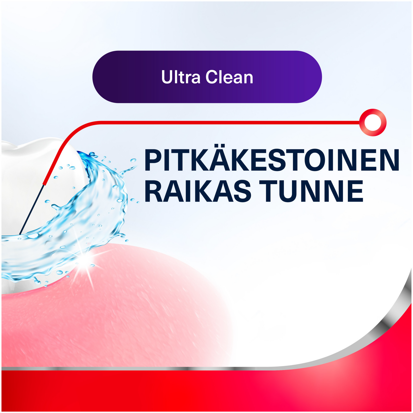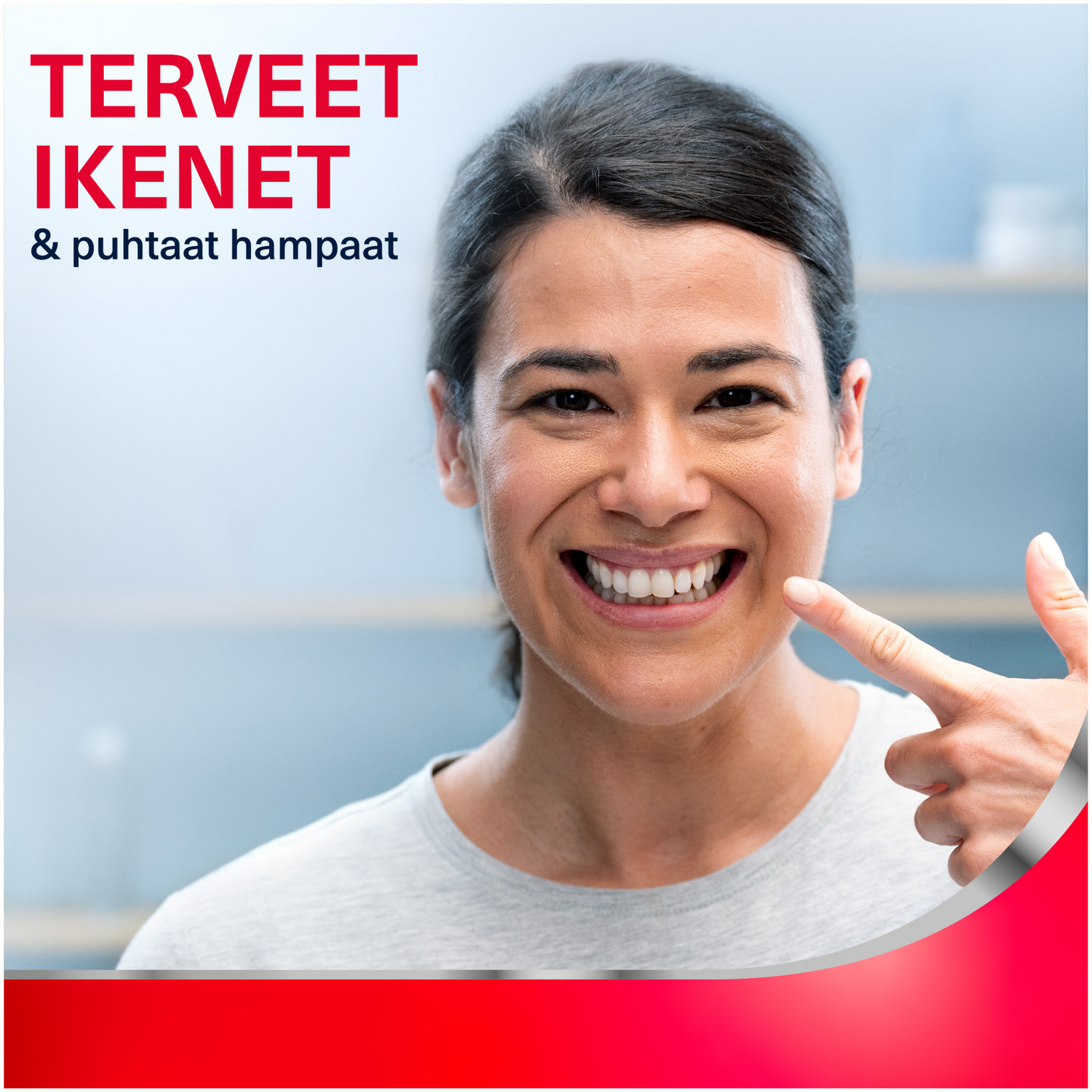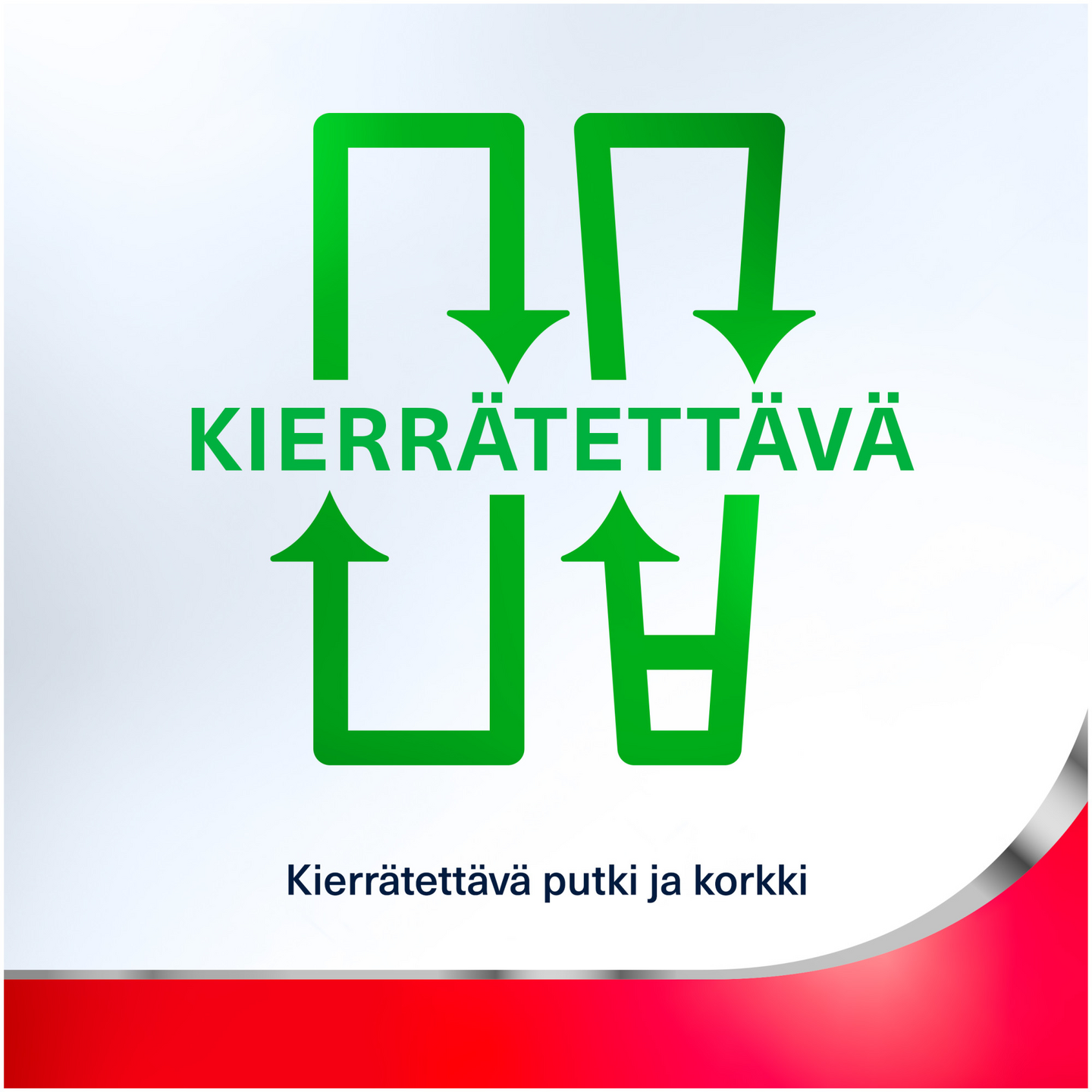 parodontax Ultra Clean on päivittäin käytettävä fluorihammastahna, joka auttaa pysäyttämään ja ehkäisemään ienten verenvuotoa kahdesti päivässä yhtäjaksoisesti käytettynä. Terveet ikenet eivät vuoda verta. Verenvuoto hampaiden harjauksen tai lankauksen yhteydessä voi olla merkki iensairaudesta. Hoitamattomana tilanne voi huonontaa suunterveyttä.Ienten verenvuoto voi johtua plakin kertymisestä ienrajaan. Plakin poistamatta jättäminen voi aiheuttaa pahanhajuista hengitystä sekä ienten punoitusta ja turvotusta ja johtaa pidemmällä aikavälillä ienten vetäytymiseen, hampaiden irtoamiseen ja lopulta hammaskatoon. parodontax on 4 kertaa tehokkaampi poistamaan plakkia (joka on ienten verenvuodon pääasiallinen syy) kuin tavallinen hammastahna.* Lisäksi parodontax Ultra Clean -hammastahna saa suun tuntumaan erittäin puhtaalta ja se auttaa palauttamaan hampaiden luonnollista valkoisuutta poistamalla hellävaraisesti hampaiden pinnan värjäytymiä. * ammattilaisen suorittaman hampaiden puhdistuksen jälkeen ja kahdesti päivässä yhtäjaksoisesti käytettynä. CE1639 -merkitty lääkinnällinen laite. Lue käyttöohjeet.