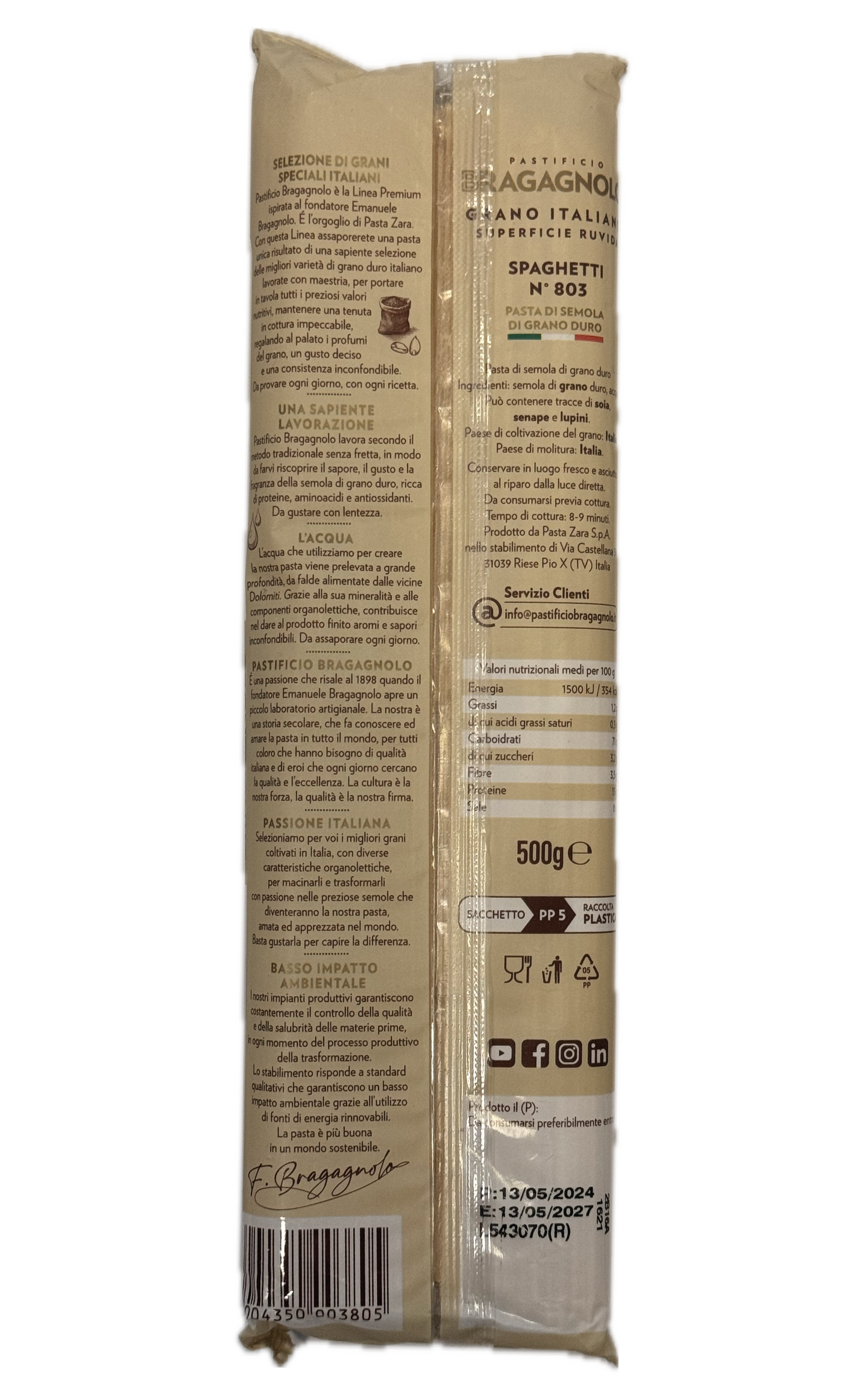 Pastificio Bragagnolo Spaghetti on perinteisin menetelmin valmistettu italialainen pasta, joka tehdään huolella valitusta italialaisesta durumvehnästä. Hitaasti valmistettava taikina ja pronssimuotilla leikattu karhea pinta takaavat erinomaisen rakenteen ja auttavat kastikkeita tarttumaan pastaan. Spaghetti on monipuolinen klassikko, joka sopii täydellisesti tomaatti- ja öljypohjaisiin kastikkeisiin, kuten Spaghetti alla Carbonaraan, Spaghetti aglio e olioon tai perinteiseen bologneseen. Karheapintainen rakenne auttaa kastikkeen imeytymistä, ja pastan joustava koostumus säilyttää al dente -rakenteensa kypsennettäessä. Perinteisesti valmistettu italialaisesta durumvehnästä – karhea pinta sitoo kastikkeen itseensä. Buon appetito! TUOTANTOPROSESSI Pastificio Bragagnolo käyttää perinteisiä tuotantoprosesseja, jotka vaativat aikaa tuodakseen esiin durumvehnäjauhon maun, mausteisuuden ja tuoksun, joka on runsas proteiinia, aminohappoja ja antioksidantteja. Elämän parhaat asiat ansaitsevat vaivaa ja kunnioitusta: varmistamme viljan kypsyyden, keräämme vettä arvokkaista pohjavesistä ja kylvöstä jauhamiseen asti. Jokainen tuotantovaihe suoritetaan huolellisesti, sillä rakastamme sitä, mitä teemme. Huomion kiinnittäminen toimitusketjuun, paikalliseen alueeseen ja raaka-aineisiin mahdollistaa sen, että saavutamme rakkaudella valmistetun pastan tyypillisen maun, mausteisuuden ja karheuden. Valvomme tarkasti jokaisen pastamme tuotantovaiheen. Maan arvokas aarre saapuu tiloihimme ja sen jälkeen perusteellisen valintaprosessin jälkeen yhdistämme sen parhaanlaatuiseen veteen lähellä sijaitsevista Dolomiiteista. Taikinaa kuljetetaan muotteja pitkin antaen sille täydellisen karheuden ja huokosuuden, jotta se voi lämpimästi sulkea kastikkeen syleilyynsä. Oikean hitaan kuivumisajan jälkeen Bragagnolo-pasta on valmis pakattavaksi. Tämä on Pasta Bragagnolo. Tällainen on lähestymistapamme pastan valmistukseen, joka perustuu viisauteen ja menneiden aikojen perinteisiin.