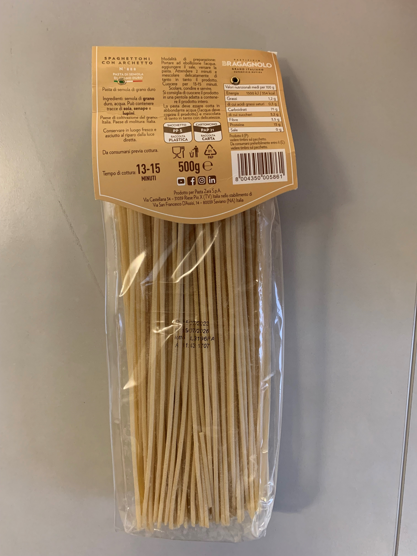 Pastificio Bragagnolo Spaghettoni con Archetto on perinteisin menetelmin valmistettu italialainen pasta, joka tehdään huolella valitusta italialaisesta durumvehnästä. Hitaasti valmistettava taikina ja pronssimuotilla leikattu karhea pinta takaavat erinomaisen rakenteen ja auttavat kastikkeita tarttumaan pastaan. Spaghettoni con Archetto on paksumpi kuin tavallinen spaghetti ja sopii erityisesti täyteläisiin kastikkeisiin, kuten ragùhun, mereneläville tai yksinkertaisiin oliiviöljyyn ja valkosipuliin perustuviin resepteihin. Sen joustava mutta napakka koostumus säilyttää al dente -rakenteensa keitettäessä. Perinteisesti valmistettu italialaisesta durumvehnästä – karhea pinta sitoo kastikkeen itseensä. Buon appetito! TUOTANTOPROSESSI Pastificio Bragagnolo käyttää perinteisiä tuotantoprosesseja, jotka vaativat aikaa tuodakseen esiin durumvehnäjauhon maun, mausteisuuden ja tuoksun, joka on runsas proteiinia, aminohappoja ja antioksidantteja. Elämän parhaat asiat ansaitsevat vaivaa ja kunnioitusta: varmistamme viljan kypsyyden, keräämme vettä arvokkaista pohjavesistä ja kylvöstä jauhamiseen asti. Jokainen tuotantovaihe suoritetaan huolellisesti, sillä rakastamme sitä, mitä teemme. Huomion kiinnittäminen toimitusketjuun, paikalliseen alueeseen ja raaka-aineisiin mahdollistaa sen, että saavutamme rakkaudella valmistetun pastan tyypillisen maun, mausteisuuden ja karheuden. Valvomme tarkasti jokaisen pastamme tuotantovaiheen. Maan arvokas aarre saapuu tiloihimme ja sen jälkeen perusteellisen valintaprosessin jälkeen yhdistämme sen parhaanlaatuiseen veteen lähellä sijaitsevista Dolomiiteista. Taikinaa kuljetetaan muotteja pitkin antaen sille täydellisen karheuden ja huokosuuden, jotta se voi lämpimästi sulkea kastikkeen syleilyynsä. Oikean hitaan kuivumisajan jälkeen Bragagnolo-pasta on valmis pakattavaksi. Tämä on Pasta Bragagnolo. Tällainen on lähestymistapamme pastan valmistukseen, joka perustuu viisauteen ja menneiden aikojen perinteisiin.