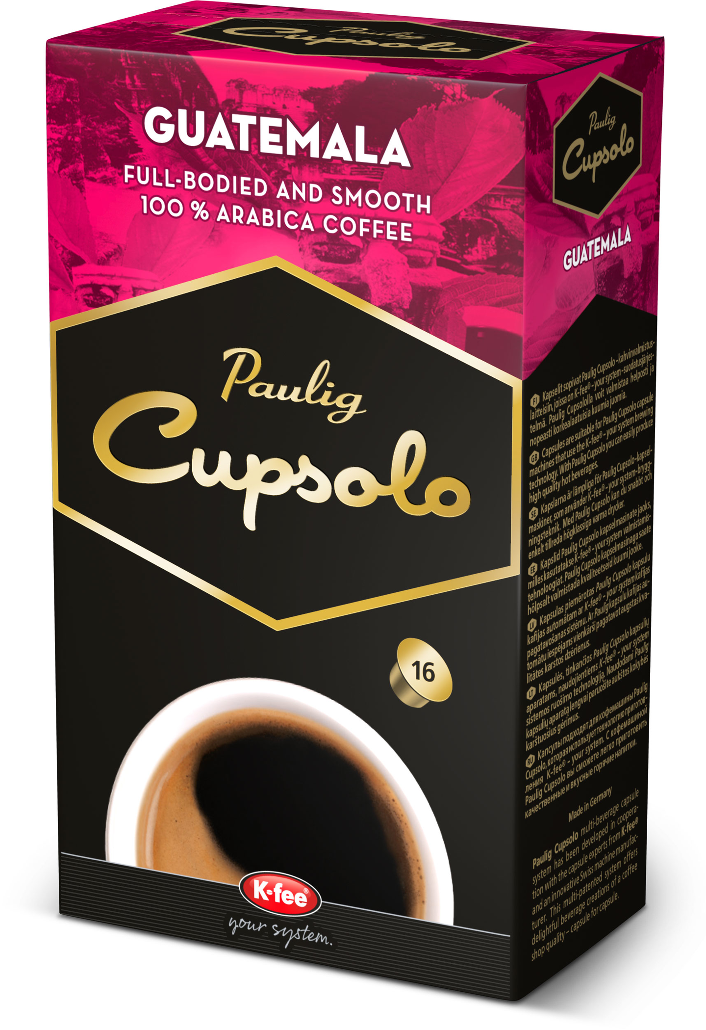 Pehmeä ja elegantti UTZ-vastuullisuussertifioitu kahvi, jossa maistuu Guatemalan vulkaanisen maaperän antama pikanttinen jälkimaku. Kapselit sopivat Paulig Cupsolo -kahvinvalmistuslaitteisiin, joissa on K-fee® -suodatusjärjestelmä.