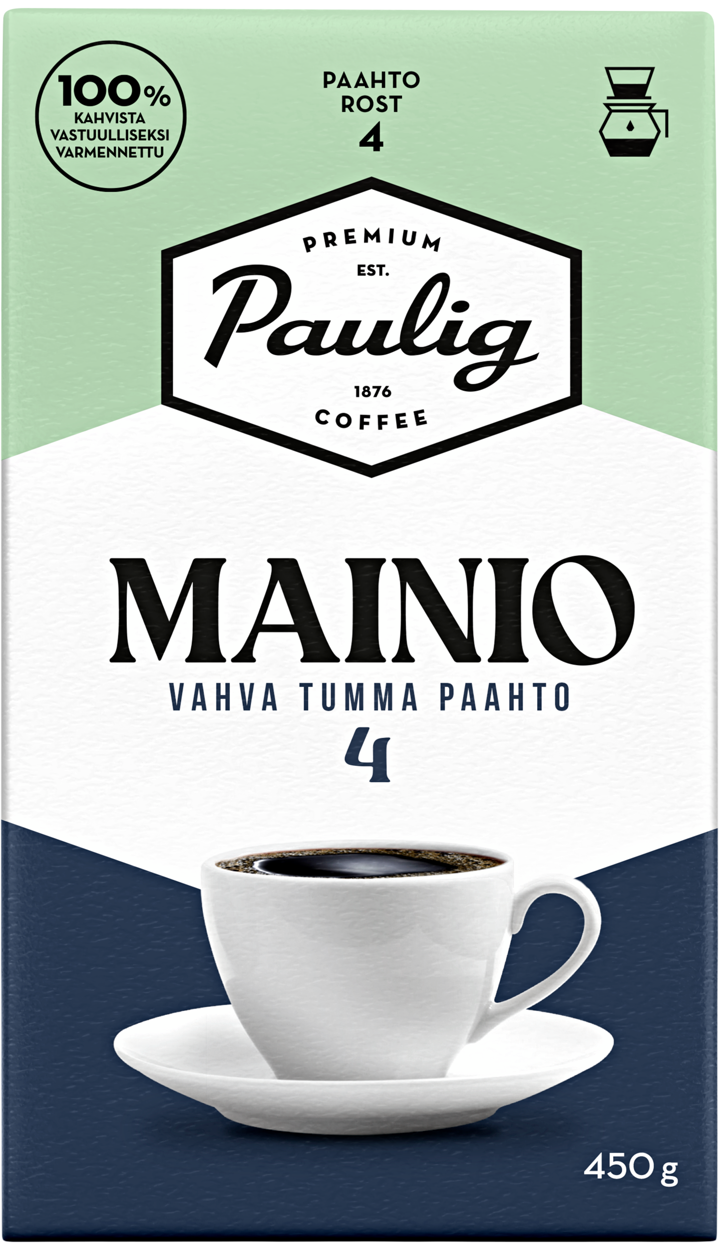 PAULIG MAINIO on tumma ja intensiivinen kahvisekoitus paahteisilla tumman suklaan vivahteilla. Rotevan kahvisekoituksen makumaailma on peräisin valituista Etelä-Amerikan arabica-kahvilaaduista ja se on viimeistelty intensiivisellä robustalla. Kahvi sopii mainiosti yhteen maidon tai kaurajuoman kanssa. Täydellinen arkikahvi!