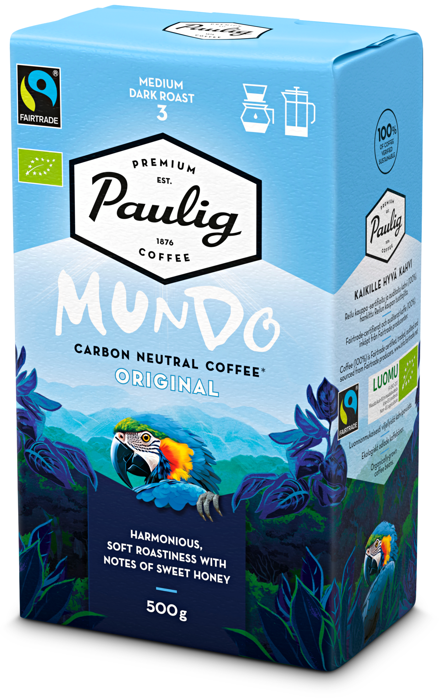 Paulig Mundo Original on suomalaiseen makuun kehitetty korkealaatuinen Reilun Kaupan vastuullisuussertifioitu luomu suodatinkahvi. Kahvin raikkaassa, paahteisessa ja hunajaisessa maussa on vivahteena myös tummaa sokeria. Keskitummapaahto, paahtoaste 3. Paulig Mundon kahvipavut on viljelty luonnonmukaisin menetelmin ilman keinotekoisia lannoitteita ja torjunta-aineita. • Raikas, paahteinen ja hunajainen luomukahvisekoitus Reilun Kaupan sertifikaatilla • Valmistus suodatinmenetelmällä tai pressopannulla
