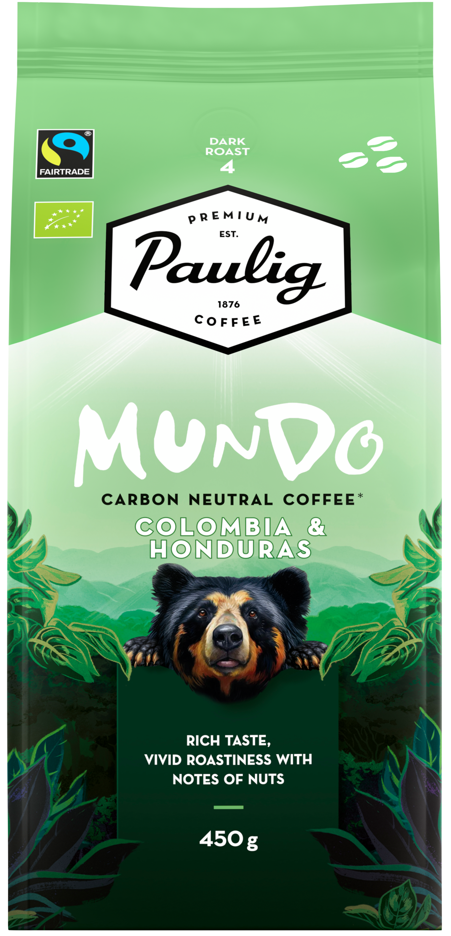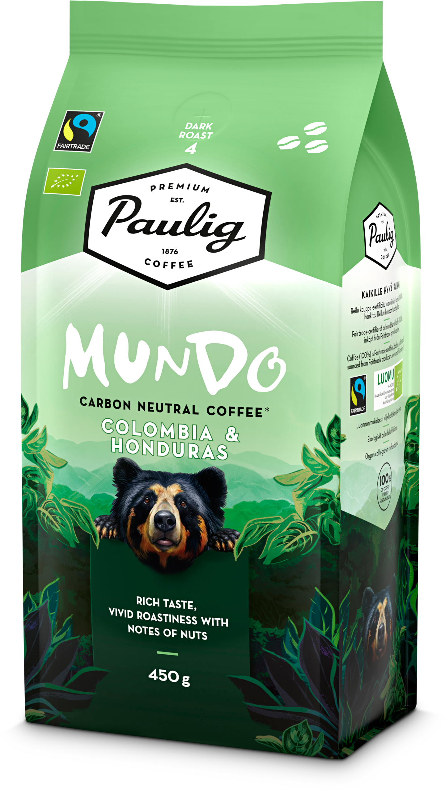 Paulig Mundo Colombia & Honduras on korkealaatuinen kahden alkuperämaan kahvi. Sen monisävyisessä maussa kietoutuvat yhteen Kolumbian vivahteikkaat, sekä Hondurasin ryhdikkäät kahvipavut, luonteikkaaksi makuelämykseksi. Paulig Mundon kahvipavut on viljelty luonnonmukaisin menetelmin ilman keinotekoisia lannoitteita ja torjunta-aineita. Tämän tummapaahtoisen kahvin mausta voit löytää vaahterasiirappista makeutta ja paahdettujen pähkinöiden vivahteita. Kaikilla Mundo-kahveilla on Reilu kauppa ja Luomu -sertifikaatit. Tummapaahto, paahtoaste 4. Papukahvi