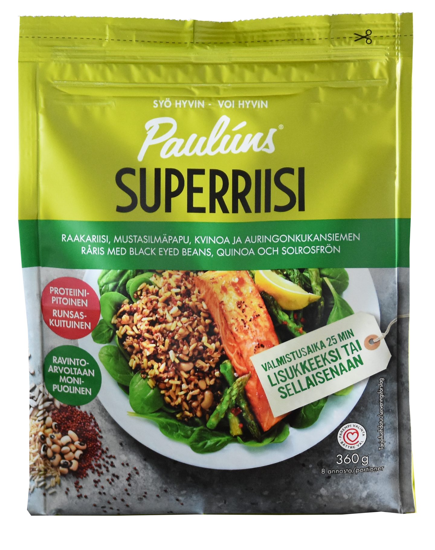 Paulúns SuperRiisi mustasilmäpapu on sekoitus raakariisiä, kvinoaa, papuja, siemeniä, linssejä ja mausteita. SuperRiisi on ravintori kas ruoan lisäke, ilman lisättyä suolaa tai lisäaineita.