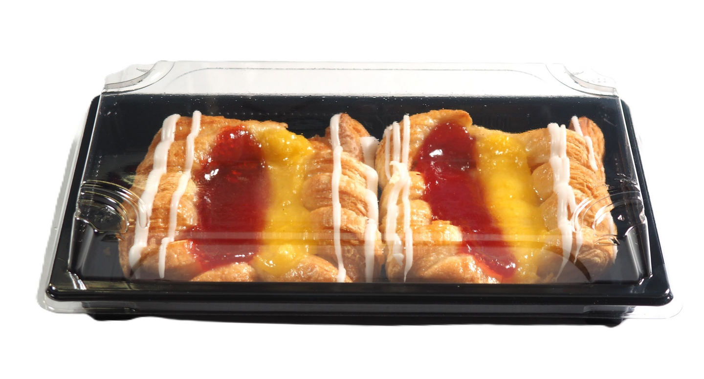 Herkullinen viineri vaniljakreemi- ja mansikkamarmeladitäytteellä. Päällä makeaa pomadaraitaa.