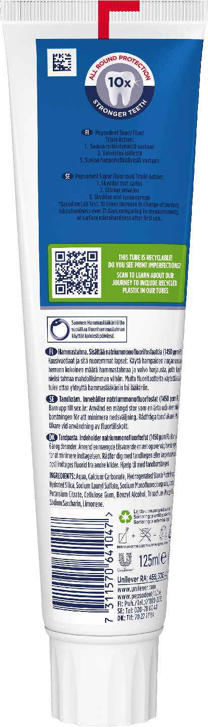 Pepsodent Super Fluor on raikas ja miedonmakuinen koko perheen perushammastahna. Pepsodent Super Fluor -hammastahna vähentää happohyökkäyksen hampaiden kiillettä liuottavaa vaikutusta ja ehkäisee kariesta. Pepsodent Super Fluor raikastaa suun samalla kun hampaat puhdistuvat perusteellisesti: tuloksena on raikas hengitys koko perheelle ja vähemmän reikiä hampaissa. Pepsodent Super Fluor vahvistaa hampaidesi kiillettä ja sisältää suositellun määrän fluoria, 1450 ppm. Fluori voi korjata pinnallisia hammasvaurioita ja estää uusien syntymistä. Parhaan tuloksen saavuttamiseksi, annostele kaksi grammaa hammastahnaa (n. 2 cm pituinen nokare) harjalle. Älä huuhtele suuta pesun jälkeen. Jokainen hymy on tärkeä. Pepsodent on hammashoidon asiantuntija, jonka valikoimasta löydät tuotteet koko perheelle. Pepsodentillä on pitkä kokemus hampaiden terveyden edistämisestä ja se on vuosien aikana kerännyt runsaasti tietoa suun terveydestä, mikä auttaa parantamaan suun terveyttä kaikissa elämänvaiheissa. Haluamme että sinun suusi voi hyvin ja että voit tehdä varmoja suun terveyttä edistäviä valintoja sekä itsellesi että perheellesi. Siksi tarjoamme erinomaisen kestävän suojan hampaillesi vastuullisesti. Pyrimme levittämään oikeita käytäntöjä parhaaseen hampaiden hoitoon, sillä ennaltaehkäisy on avain terveeseen ja iloiseen suuhun. Koska meille jokainen hymy on tärkeä, mikään saa olla hymyn tiellä. Siksi olemme useiden vuosien ajan keskittyneet aktiivisesti suun terveyden parantamiseen yhdessä sairaanhoitajien, opettajien ja vapaaehtoisten kanssa. Pepsodentin suunhoitoaktiviteetteihin kuuluu kouluille tarkoitettuja ohjelmia, ilmaisia hammastarkastuksia ja yhteisöavustusohjelmia, jotka tavoittavat yli viisi miljoonaa ihmistä vuosittain ympäri maailmaa. Opetamme koululaisia huolehtimaan suun terveydestä oikein. Annamme vinkkejä hyvään hampaiden harjaukseen. Kerromme oikeanlaisesta suun hoidosta hauskalla, vakuuttavalla ja interaktiivisella tavalla. Ohjelmamme kannustavat pitkäaikaisiin harjaustottumuksiin. Tavoitteena on saavuttaa mitattavia parannuksia sekä lasten että aikuisten suun terveydessä kaikkialla maailmassa. Pepsodent on tehnyt töitä parempien harjaustottumusten levittämiseksi yli 25 vuoden ajan.
