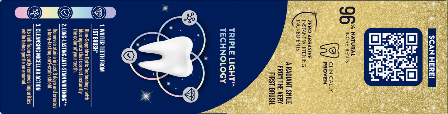 Uusi Pepsodent White Now 3in1 Hello Glow -hammastahna tekee hampaista välittömästi valkoisemmat ja antaa sinulle säteilevän hymyn heti ensimmäisellä harjauksella. Sen sisältämä Triple Light™ -teknologia auttaa tekemään hampaista valkoisemmat kolmivaikutteisesti, samalla kun se on hellävarainen kiilteelle. Saa nyt upea säteilevä hymysi takaisin! Pepsodent White Now 3in1 Hello Glow -hammastahnan kolmivaikutteinen vaikutus perustuu kolmeen toimintoon: 1) Hammastahnan optinen Blue-Sapphire-teknologia muodostaa hampaiden pinnalle ohuen sinisen kalvon, jonka vaikutuksesta hampaiden väri korjaantuu välittömästi. Näin hampaista tulee valkoisemmat heti ensimmäisellä harjauskerralla*. 2) Hammastahna poistaa pinttyneet tahrat hampaista pitkäkestoisesti** ja tekee näin hampaista valkoisemmat vain kolmessa päivässä. Lisäksi se tarjoaa hampaille pitkävaikutteisen suojan tahroja vastaan. 3) Hammastahnan runsas vaahto ja misellipuhdistus poistaa epäpuhtaudet hellästi ja on samalla hellävarainen kiilteelle. Lopputuloksena on raikas suu ja valkoisemmat hampaat! Pepsodent White Now 3in1 Hello Glow on valkaiseva hammastahna, joka sisältää 96 % luonnollista alkuperää olevia ainesosia ja sen on kliinisesti todistettu olevan hellävarainen kiilteelle, samalla kun se tekee hampaista valkoisemmat. Samasta sarjasta löydät myös Pepsodent White Now 3in1 -hammastahnan, joka tekee hampaistasi ihanan puhtaat ja valkoisemmat. Me Pepsodentillä uskomme, että hymysi ilmentää persoonallisuuttasi ja itseluottamustasi. Suun terveys on meille tärkeää ja tavoitteenamme onkin parantaa hampaiden ja suun terveyttä kaikilla, jotta jokainen meistä voi hymyillä vapaasti. Vuodesta 1961 lähtien Pepsodent on pyrkinyt opettamaan ihmisille oikeita käytäntöjä hampaiden pesuun jo varhaisesta iästä lähtien ja osoittamaan, miten tärkeää on harjata hampaat kahdesti päivässä aamuin ja illoin. Myös maapallon suojelu on meille sydämen asia ja pyrimme rajoittamaan tuotteidemme ympäristövaikutuksia. *Valkoisuuden vaikutelma on väliaikainen. Kliininen tutkimus, jossa tutkittiin välitöntä valkoisuuden vaikutelmaa. Vertailussa oli tavallinen fluorihammastahna ja 54 osanottajaa. **Säännöllisesti käytettynä kahdesti päivässä 2 viikon ajan. Kliininen testi, jossa 59 osanottajaa.