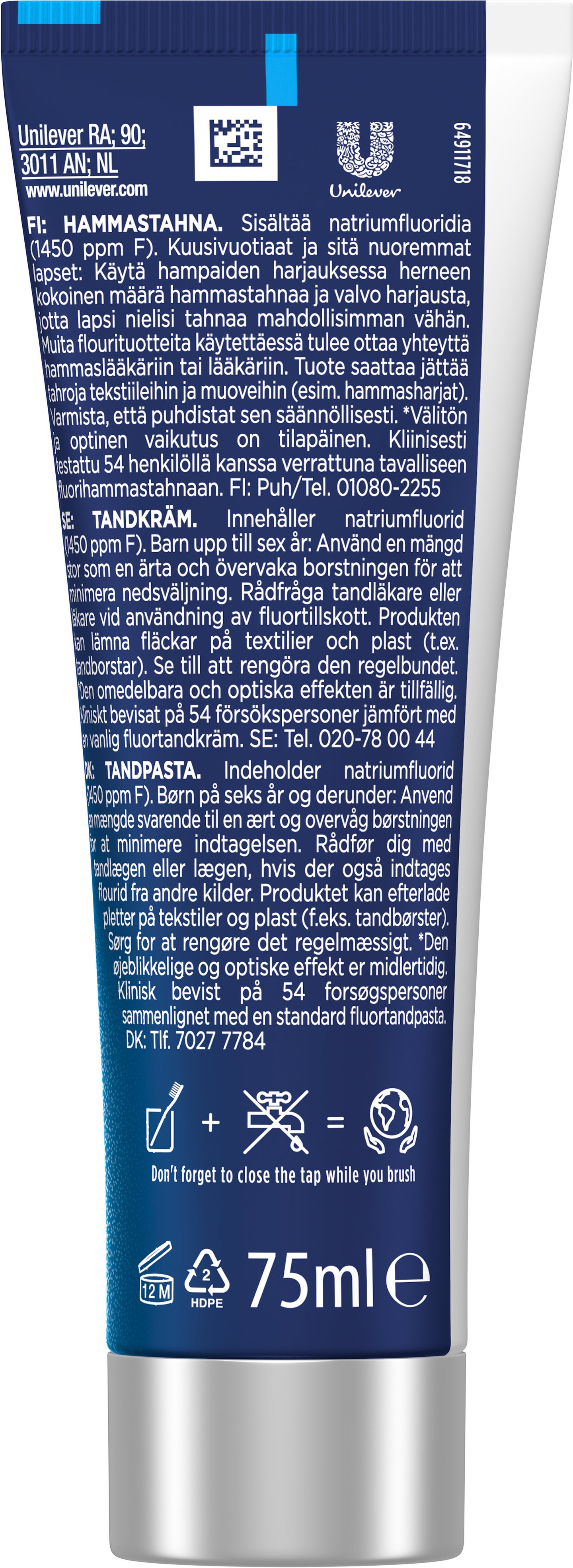 Pepsodent White Now on nimensä mukainen – fluorihammastahna, joka tekee hampaista valkoisemmat*. Mutta se on myös hammastahna, jota voit käyttää tavallisen hammastahnan tapaan joka päivä. Hammastahnassa on suositeltu fluoripitoisuus, fluoria on 1450 ppm. Tämä valkaiseva hammastahna muodostaa ohuen sinisen kalvon hampaiden pinnalle. Sininen ja keltainen ovat vastakkaisia värejä. Kun hammastahnassa oleva sininen sekoittuu hampaiden kellertävään sävyyn, syntyy optinen efekti, joka saa hampaat näyttämään valkoisemmilta ja kiiltäviltä. Kyseessä on ns. optinen valkaisuvaikutus, jonka avulla saat valkoisemmat hampaat välittömästi. Pepsodent White Now -hammastahna on raikkaan makuinen. Jokainen hymy on tärkeä. Pepsodent on hammashoidon asiantuntija, jonka valikoimasta löydät tuotteet koko perheelle. Pepsodentillä on pitkä kokemus hampaiden terveyden edistämisestä ja se on vuosien aikana kerännyt runsaasti tietoa, joka auttaa parantamaan suun terveyttä kaikissa elämänvaiheissa. Haluamme että sinun suusi voi hyvin ja että voit tehdä varmoja suun terveyttä edistäviä valintoja sekä itsellesi että perheellesi. Siksi tarjoamme erinomaisen kestävän suojan hampaillesi vastuullisesti. Pyrimme levittämään oikeita käytäntöjä parhaaseen hampaiden hoitoon, sillä ennaltaehkäisy on avain terveeseen ja iloiseen suuhun. Koska meille jokainen hymy on tärkeä, mikään saa olla hymyn tiellä – etenkään huono suuterveys. Siksi olemme useiden vuosien ajan keskittyneet aktiivisesti suun terveyden parantamiseen yhdessä sairaanhoitajien, opettajien ja vapaaehtoisten kanssa. Pepsodentin suunhoitoaktiviteetteihin kuuluu kouluille tarkoitettua ohjelmia, ilmaisia hammastarkastuksia ja yhteisöavustusohjelmia, jotka tavoittavat yli viisi miljoonaa ihmistä vuosittain ympäri maailmaa. Opetamme koululaisia huolehtimaan suun terveydestä oikein. Annamme vinkkejä hyvään hampaiden harjaukseen. Kerromme oikeanlaisesta suun hoidosta hauskalla, vakuuttavalla ja interaktiivisella tavalla. Ohjelmamme pyrkivät kannustamaan pitkäaikaisiin harjaustottumuksiin. Tavoitteena on saavuttaa mitattavia parannuksia sekä lasten että aikuisten suun terveydessä kaikkialla maailmassa. Pepsodent on tehnyt töitä parempien harjaustottumusten levittämiseksi yli 25 vuoden ajan. *Kliininen tutkimus optisesta valkaisevasta vaikutelmasta mitattuna 79 koehenkilöllä. Valkaiseva vaikutelma on tilapäinen
