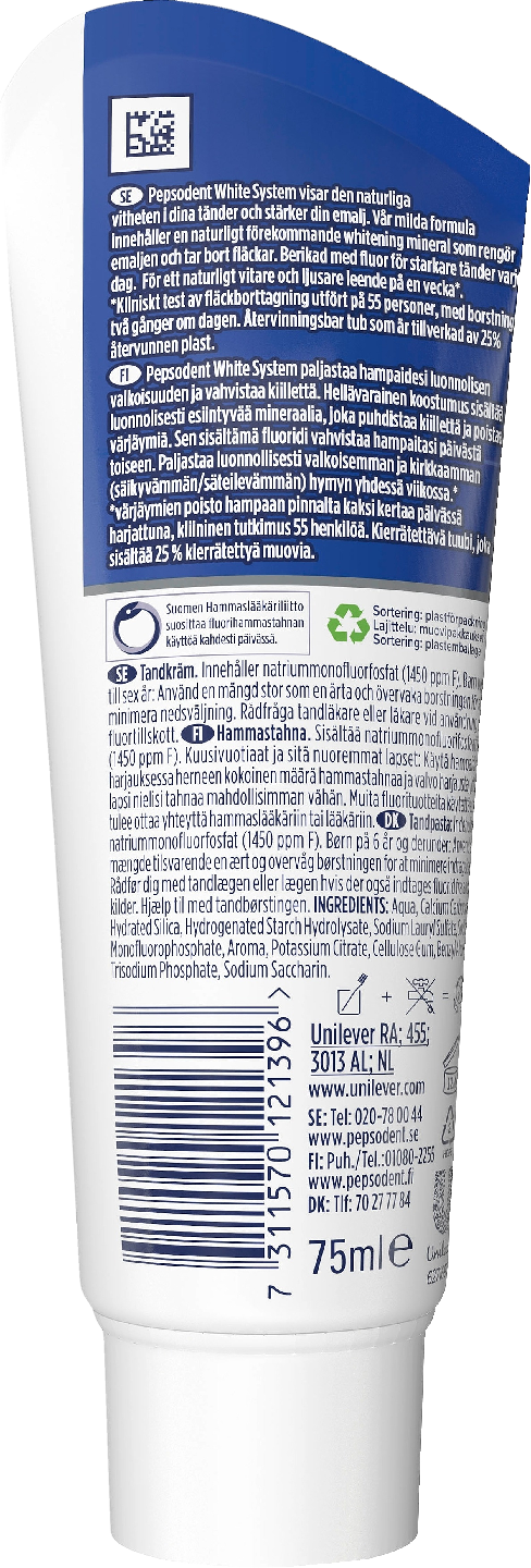 Pepsodent White System –tahnan säännöllinen käyttö auttaa saavuttamaan luonnollisen valkoisen hymyn ja poistaa hampaan pinnallisia tummentumia hellävaraisesti. Valkoinen hymy ja raikas hengitys! Pepsodent White System 75 ml on hammastahna, joka on erityisesti kehitetty poistamaan värjäytymiä – valkoisemmat hampaat kahdessa viikossa*. Säännöllinen fluoria sisältävän Pepsodent White System -hammastahnan käyttö auttaa palauttamaan luonnollisen valkoisen hymyn – ja ehkäisemään kariesta! Pepsodent on koko perheen hammashoidon asiantuntija. Laajasta valikoimastamme löydät tuotteet jokaiselle hyvään suun terveyteen. Käytämme kaiken hampaiden hoidosta kertyneen kokemuksemme tieteellisen tietomme auttaakseen perheitä parantamaan suun terveyttä kaikissa elämänvaiheissa. Jokainen hymy on tärkeä! Mielestämme kaikilla on oikeus hyvään suun terveyteen. Haluamme sinun olevan varma siitä, että teet oikeita valintoja itsellesi ja perheellesi. Jakamalla tietoa, kannustamme oikeaan hampaiden hoitoon, sillä ennaltaehkäisevä työ ja ajattelu on terveen ja iloisen suun tärkein tekijä. Siksi olemme useiden vuosien ajan keskittyneet aktiivisesti suun terveyden parantamiseen yhdessä sairaanhoitajien, opettajien ja vapaaehtoisten kanssa. Pepsodentin suunhoitoaktiviteetteihin kuuluu kouluille tarkoitettuja ohjelmia, ilmaisia hammastarkastuksia ja yhteisöavustusohjelmia, jotka tavoittavat yli viisi miljoonaa ihmistä vuosittain ympäri maailmaa. Opetamme koululaisille vinkkejä ja tekniikoita hampaiden harjauksesta ja oikeanlaisesta suun hoidosta hauskalla, vakuuttavalla ja interaktiivisella tavalla. Ohjelmamme pyrkivät kannustamaan pitkäaikaisiin harjaustottumuksiin. Tavoitteena on saavuttaa mitattavia parannuksia sekä lasten että aikuisten suun terveydessä kaikkialla maailmassa. Pepsodent on tehnyt töitä parempien harjaustottumusten levittämiseksi yli 25 vuoden ajan. * Kliininen tutkimus suoritettiin 76 henkilölle.