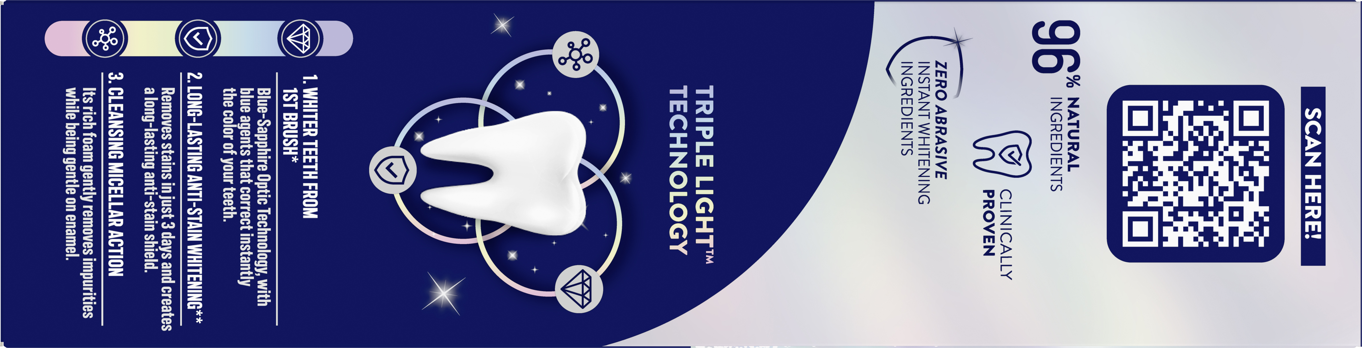 Uusi Pepsodent White Now 3in1 -hammastahna tekee hampaista välittömästi valkoisemmat ja antaa sinulle säteilevän hymyn heti ensimmäisellä harjauksella. Sen sisältämä Triple Light™ -teknologia auttaa tekemään hampaista valkoisemmat kolmivaikutteisesti, samalla kun se on hellävarainen kiilteelle. Saa nyt upea hymysi takaisin! Pepsodent White Now 3in1 -hammastahnan kolmivaikutteinen vaikutus perustuu kolmeen toimintoon: 1) Hammastahnan optinen Blue-Sapphire-teknologia muodostaa hampaiden pinnalle ohuen sinisen kalvon, jonka vaikutuksesta hampaiden väri korjaantuu välittömästi. Näin hampaista tulee valkoisemmat heti ensimmäisellä harjauskerralla*. 2) Hammastahna poistaa pinttyneet tahrat hampaista pitkäkestoisesti** ja tekee näin hampaista valkoisemmat vain kolmessa päivässä. Lisäksi se tarjoaa hampaille pitkävaikutteisen suojan tahroja vastaan. 3) Hammastahnan runsas vaahto ja misellipuhdistus poistaa epäpuhtaudet hellästi ja on samalla hellävarainen kiilteelle. Lopputuloksena on raikas suu ja valkoisemmat hampaat! Pepsodent White Now 3in1 hammastahna sisältää 96 % luonnollista alkuperää olevia ainesosia ja sen on kliinisesti todistettu olevan hellävarainen kiilteelle, samalla kun se tekee hampaista valkoisemmat. Samasta sarjasta löydät myös Pepsodent White Now Hello Glow -hammastahnan, joka tekee hampaistasi ihanan puhtaat ja valkoisemmat. Me Pepsodentillä uskomme, että hymysi ilmentää persoonallisuuttasi ja itseluottamustasi. Suun terveys on meille tärkeää ja tavoitteenamme onkin parantaa hampaiden ja suun terveyttä kaikilla, jotta jokainen meistä voi hymyillä vapaasti. Vuodesta 1961 lähtien Pepsodent on pyrkinyt opettamaan ihmisille oikeita käytäntöjä hampaiden pesuun jo varhaisesta iästä lähtien ja osoittamaan, miten tärkeää on harjata hampaat kahdesti päivässä aamuin ja illoin. Myös maapallon suojelu on meille sydämen asia ja pyrimme rajoittamaan tuotteidemme ympäristövaikutuksia. *Valkoisuuden vaikutelma on väliaikainen. Kliininen tutkimus, jossa tutkittiin välitöntä valkoisuuden vaikutelmaa. Vertailussa oli tavallinen fluorihammastahna ja 54 osanottajaa. **Säännöllisesti käytettynä kahdesti päivässä 2 viikon ajan. Kliininen testi, jossa 59 osanottajaa.