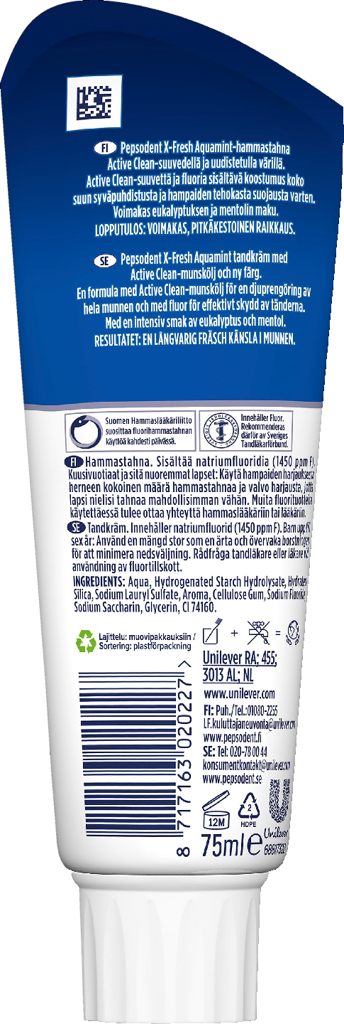Pepsodent X-Fresh Aquamint on hammastahna, joka sopii kaikille, jotka haluavat tuntea pitkäkestoisen raikkauden hampaiden harjauksen jälkeen. X-Fresh Aquamint sisältää eukalyptusta, mentolia, Active Clean -suuvettä ja fluoria. Pepsodent X-Fresh Aquamint on geelimäinen hammastahna, jossa on tuoreen eukalyptuksen ja mentolin maku. Pepsodent-hammastahna X-Fresh Aquamintin edut: • Fluorihammastahnan vaikutus ja teho, suuveden raikkautta • Tuote sisältää fluoria (1450 ppm), joka vähentää hammaskiilteen liukenemista happohyökkäyksen aikana ja ehkäisee kariesta. • 75 ml. Pepsodent on hammashoidon asiantuntija, jonka valikoimasta löydät tuotteet koko perheelle. Haluamme että sinun suusi voi hyvin ja että voit tehdä varmoja suun terveyttä edistäviä valintoja sekä itsellesi että perheellesi. Siksi tarjoamme erinomaisen kestävän suojan hampaillesi vastuullisesti. Pyrimme levittämään oikeita käytäntöjä parhaaseen hampaiden hoitoon, sillä ennaltaehkäisy on avain terveeseen ja iloiseen suuhun. Koska meille jokainen hymy on tärkeä, mikään ei saa olla hymyn tiellä – etenkään huono suuterveys. Siksi olemme useiden vuosien ajan keskittyneet aktiivisesti suun terveyden parantamiseen yhdessä sairaanhoitajien, opettajien ja vapaaehtoisten kanssa. Pepsodentin suunhoitoaktiviteetteihin kuuluu kouluille tarkoitettuja ohjelmia, ilmaisia hammastarkastuksia ja yhteisöavustusohjelmia, jotka tavoittavat yli viisi miljoonaa ihmistä vuosittain ympäri maailmaa. Opetamme koululaisia huolehtimaan suun terveydestä oikein. Annamme vinkkejä hyvään hampaiden harjaukseen. Kerromme oikeanlaisesta suun hoidosta hauskalla, vakuuttavalla ja interaktiivisella tavalla. Ohjelmamme kannustavat pitkäaikaisiin harjaustottumuksiin. Tavoitteena on saavuttaa mitattavia parannuksia sekä lasten että aikuisten suun terveydessä kaikkialla maailmassa. Pepsodent on tehnyt töitä parempien harjaustottumusten levittämiseksi yli 25 vuoden ajan.