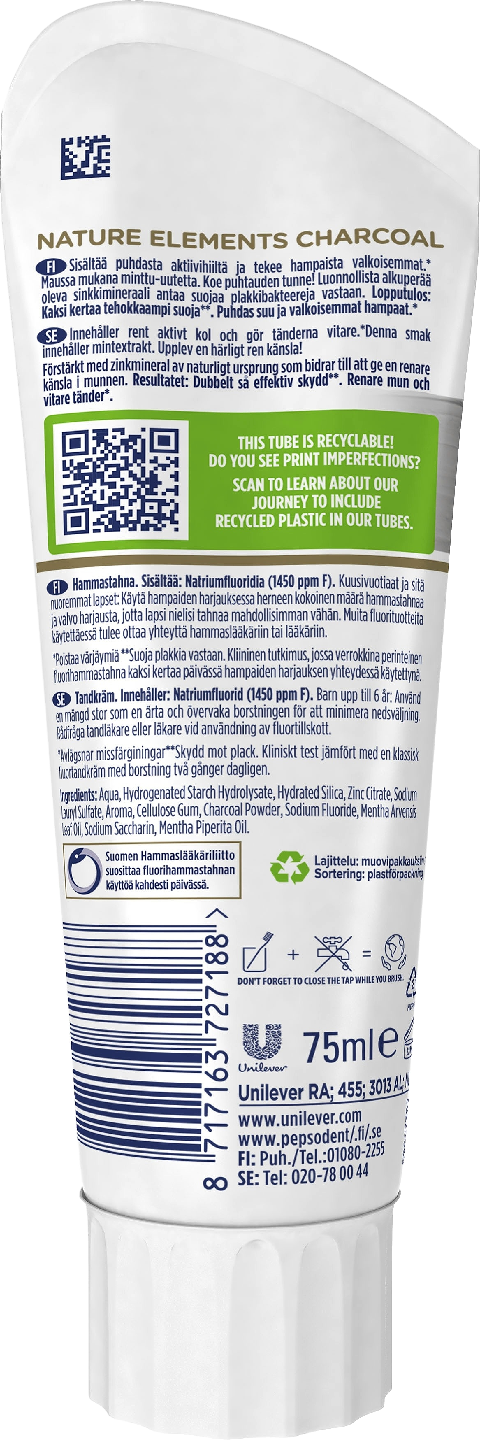 Pepsodent Long Active Nature Elements Charcoal on luonnollisia ainesosia, kuten hiilijauhetta sisältävä hammastahna. Hiilijauhe sekä valkaisee että puhdistaa hampaita. Hammastahna poistaa värjäymiä ja saat näin valkoisemmat hampaat. Nyt saat hammastahnan uudessa kierrätettävässä tuubissa. Pepsodent tarjoaa laajan valikoiman laadukkaita tuotteita, joilla pidät huolta hyvästä suun terveydestä. Säännöllinen hampaidenpesu on tie hyvään suunhoitoon ja terveisiin sekä kestäviin hampaisiin. Iensairaudet johtuvat pääasiassa huonosta hampaiden harjauksesta ja liian vähäisestä hammaslangan käytöstä. Pese hampaat vähintään kahdesti päivässä pehmeällä tai hammaslääkärin suosittelemalla hammasharjalla. Jokainen hymy on tärkeä. Pepsodent on hammashoidon asiantuntija, jonka valikoimasta löydät tuotteet koko perheelle. Pepsodentillä on pitkä kokemus hampaiden terveyden edistämisestä ja se on vuosien aikana kerännyt runsaasti tietoa, mikä auttaa parantamaan suun terveyttä kaikissa elämänvaiheissa. Haluamme että sinun suusi voi hyvin ja että voit tehdä varmoja suun terveyttä edistäviä valintoja sekä itsellesi että perheellesi. Siksi tarjoamme erinomaisen kestävän suojan hampaillesi vastuullisesti. Pyrimme levittämään oikeita käytäntöjä parhaaseen hampaiden hoitoon, sillä ennaltaehkäisy on avain terveeseen ja iloiseen suuhun. Olemme useiden vuosien ajan keskittyneet aktiivisesti suun terveyden parantamiseen yhdessä sairaanhoitajien, opettajien ja vapaaehtoisten kanssa. Pepsodentin suunhoitoaktiviteetteihin kuuluu kouluille tarkoitettuja ohjelmia, ilmaisia hammastarkastuksia ja yhteisöavustusohjelmia, jotka tavoittavat yli viisi miljoonaa ihmistä vuosittain ympäri maailmaa. Annamme koululaisille vinkkejä parempaan suun terveyteen ja opetamme tekniikoita oikeaoppiseen hampaiden harjaukseen mielenkiintoisella, vaikuttavalla ja interaktiivisella tavalla. Ohjelmamme kannustavat pitkäaikaisiin harjaustottumuksiin. Tavoitteena on saavuttaa mitattavia parannuksia sekä lasten että aikuisten suun terveydessä kaikkialla maailmassa. Pepsodent on tehnyt töitä parempien harjaustottumusten levittämiseksi yli 25 vuoden ajan.