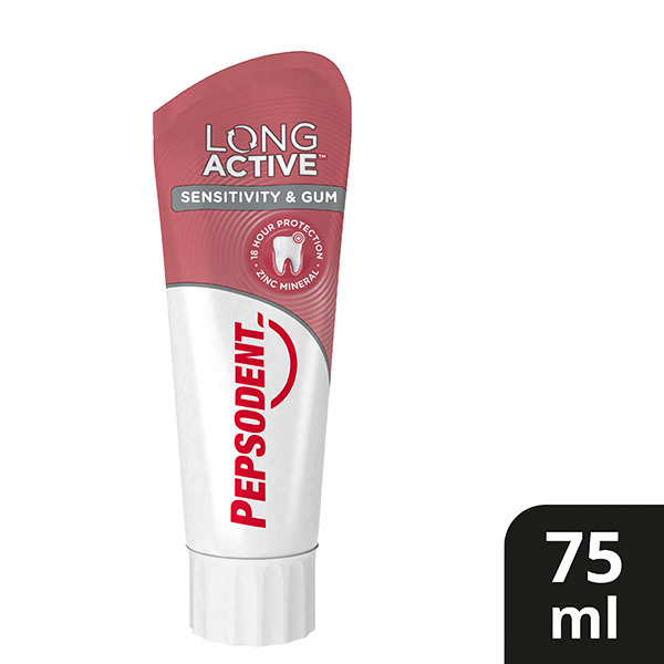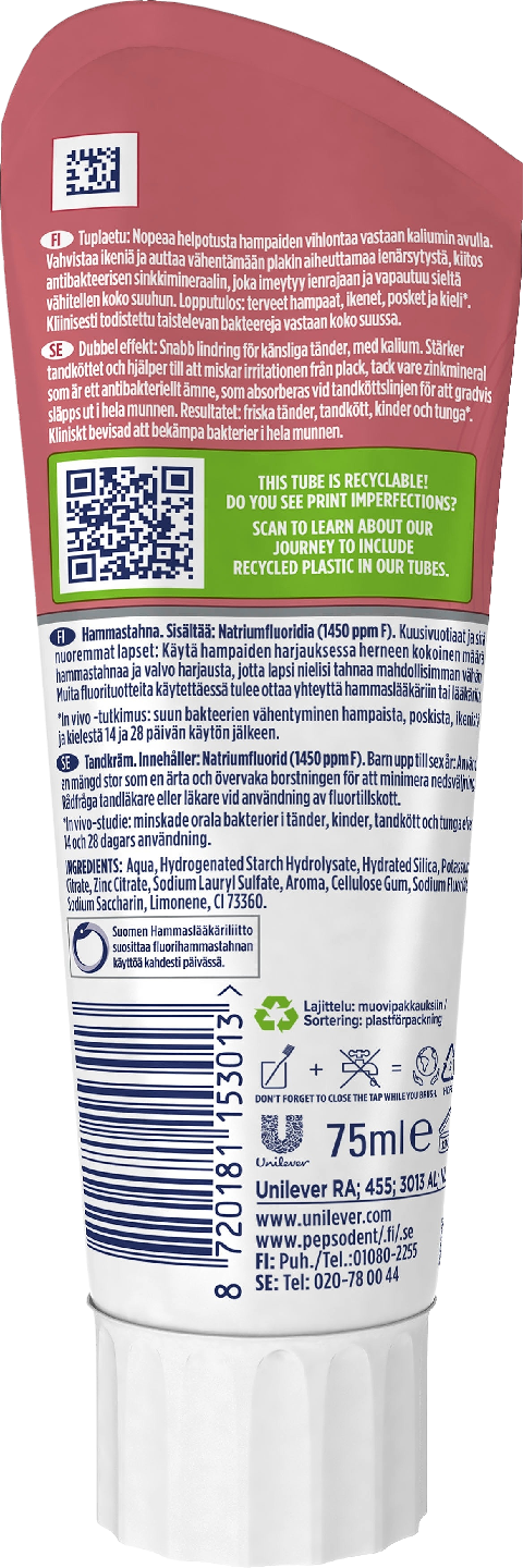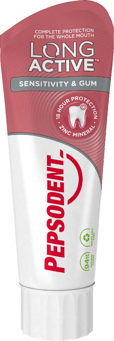 Pepsodent Long Active Sensitivity & Gum on hellävarainen hammastahna, joka valmistetaan 96 %:sesti luonnollisista ainesosista. Tervet hampaat, ikenet ja koko suu. Kaksoisvaikutus: Nopea karieksen lievitys kaliumilla. Hammastahnan koostumukseen lisätään enemmän sinkkiä, joka on luonnollista alkuperää oleva antibakteerinen aine. Sinkki auttaa torjumaan bakteereja, suojaa plakilta ja parantaa suun terveyttä. Pepsodent Sensitivity & Gum vahvistaa ikeniä, suojaa plakilta ja auttaa vähentämään plakin aiheuttamaa ikenien ärsytystä. Pepsodent Long Active Sensitive & Gum -hammastahnalla on kliinisesti todistettu teho suun bakteereja vastaan. *In vivo -tutkimus: suun bakteerien väheneminen hampaissa, poskissa, ikenissä ja kielessä 14 ja 28 päivän käytön jälkeen. Iensairaudet johtuvat pääasiassa huonosta hampaiden harjauksesta ja liian vähäisestä hammaslangan käytöstä. Suositus on, että harjaat hampaat vähintään kahdesti päivässä pehmeällä tai hammaslääkärin sinulle suosittelemalla hammasharjalla. Jokainen hymy on tärkeä. Pepsodent on hammashoidon asiantuntija, jonka valikoimasta löydät tuotteet koko perheelle. Haluamme että sinun suusi voi hyvin ja että voit tehdä varmoja suun terveyttä edistäviä valintoja sekä itsellesi että perheellesi. Siksi tarjoamme erinomaisen kestävän suojan hampaillesi vastuullisesti. Pyrimme levittämään oikeita käytäntöjä parhaaseen hampaiden hoitoon, sillä ennaltaehkäisy on avain terveeseen ja iloiseen suuhun. Olemme useiden vuosien ajan keskittyneet aktiivisesti suun terveyden parantamiseen yhdessä sairaanhoitajien, opettajien ja vapaaehtoisten kanssa. Pepsodentin suunhoitoaktiviteetteihin kuuluu kouluille tarkoitettuja ohjelmia, ilmaisia hammastarkastuksia ja yhteisöavustusohjelmia, jotka tavoittavat yli viisi miljoonaa ihmistä vuosittain ympäri maailmaa. Opetamme koululaisille vinkkejä ja tekniikoita hampaiden harjauksesta ja oikeanlaisesta suun hoidosta hauskalla, vakuuttavalla ja interaktiivisella tavalla. Ohjelmamme kannustavat pitkäaikaisiin harjaustottumuksiin. Tavoitteena on saavuttaa mitattavia parannuksia sekä lasten että aikuisten suun terveydessä kaikkialla maailmassa. Pepsodent on tehnyt töitä parempien harjaustottumusten levittämiseksi yli 25 vuoden ajan.
