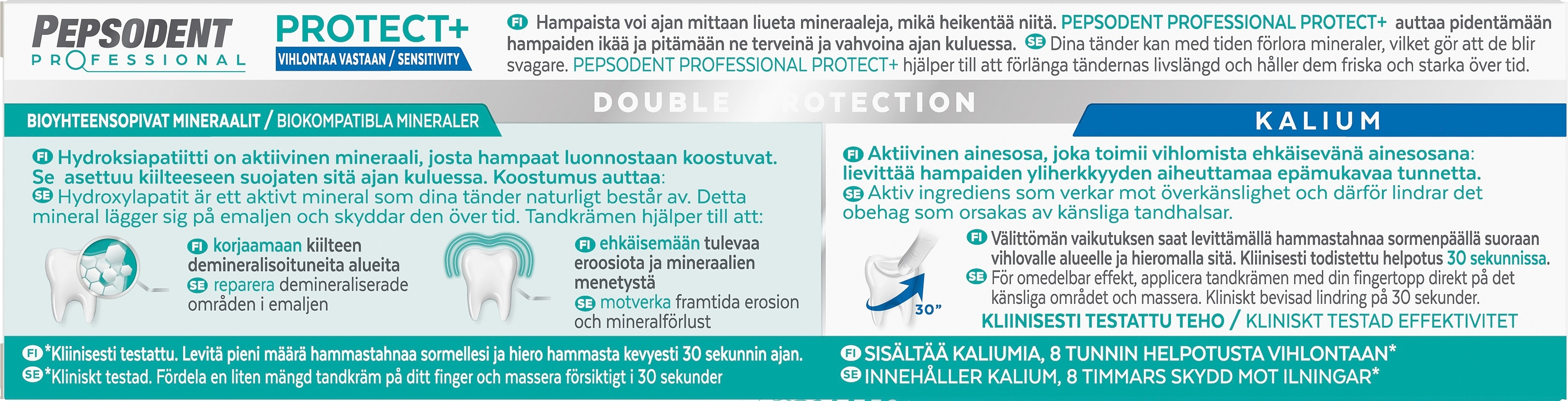 Pepsodent Professional Protect+ Sensitivity on hammastahna, joka antaa kaksinkertaisen suojan hampaille. Se auttaa palauttamaan hampaiden menetettyjä mineraaleja ja suojaa hampaita reikiintymiseltä. Pepsodent Professional Protect+ Sensitivity auttaa korjaamaan alkavia kiillevaurioita. Herkille hampaille kehitetty hammastahna sisältää kaliumia, joka helpottaa hampaiden vihlomista. Kun haluat nopeasti lievittää vihlovaa hammasta, hiero hammastahnaa sormella herkälle ja vihlovalle alueelle. Pepsodentillä on pitkä kokemus hampaiden terveyden edistämisestä ja se on vuosien aikana kerännyt runsaasti tietoa, mikä auttaa parantamaan suun terveyttä kaikissa elämänvaiheissa. Tehokas hammashoito on tärkeää! Haluamme että sinun suusi voi hyvin ja että voit tehdä varmoja suun terveyttä edistäviä valintoja sekä itsellesi että perheellesi. Hampaiden harjaamisen perusteet: Pese hampaat ainakin kahdesti päivässä, aamulla, joko ennen aamiaista tai puoli tuntia aamiaisen jälkeen, ja ennen nukkumaan menoa. Voit harjata hampaasi myös lounaan tai muitten aterioitten jälkeen. Muista tällöin odottaa 30 minuuttia. Jos harjaat happohyökkäyksen ollessa vielä käynnissä, saatat vahingoittaa haavoittuvassa tilassa olevaa hammaskiillettäsi. Jo sinulla ei ole mahdollista odottaa niin pitkään, huuhtele suusi kahteen kertaan vedellä vähentääksesi happojen vaikutuksia.