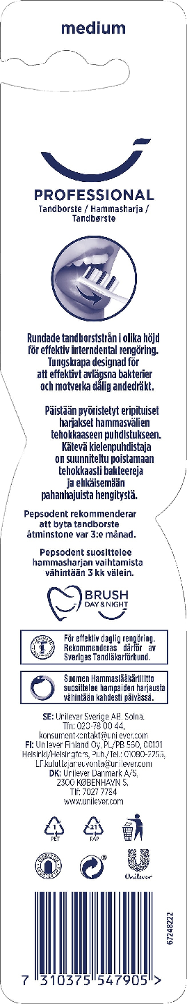 Hampaiden tehokas ja perusteellinen puhdistus onnistuu Pepsodent Professional hammasharjalla. Anatomisesti muotoillun hammasharjan harjapäässä olevat harjakset ovat erikorkuisia, jotta ne ulottuvat helpommin vaikeapääsyisiin hammasväleihin. Harjan kolmikulmainen varsi helpottaa ulottumista kaikkialle suuhun: harja pesee myös takahampaat tehokkaasti. Pepsodent Professional on hammasharja, jonka jokainen perheenjäsen voi valita omaksi harjakseen. Hammasharjasta on saatavana keskikovan harjaspään (Medium) lisäksi kaksi muuta versiota. Valitse harjasi hampaiden ja ikenien herkkyydestä riippuen: erittäin pehmeä (Extra Soft), pehmeä (Soft) tai keskikova (Medium). Isot suut. Pienet suut. Maitohampaat. Pysyvät hampaat. Pepsodent pitää huolen koko perheen hampaista iästä riippumatta. Pepsodent on hammashoidon asiantuntija, jonka valikoimasta jokainen löytää itselleen sopivan hammasharjan, hammastahnan ja suuveden. Pepsodentillä on pitkä kokemus hampaiden terveyden edistämisestä ja se on vuosien aikana kerännyt runsaasti tietoa siitä, mikä auttaa parantamaan suun terveyttä kaikissa elämänvaiheissa. Haluamme että sinun suusi voi hyvin ja että voit tehdä varmoja suun terveyttä edistäviä valintoja sekä itsellesi että perheellesi. Tarjoamme erinomaisen kestävän suojan hampaillesi vastuullisesti. Olemme useiden vuosien ajan keskittyneet aktiivisesti suun terveyden parantamiseen yhdessä sairaanhoitajien, opettajien ja vapaaehtoisten kanssa. Pepsodentin suunhoitoaktiviteetteihin kuuluu kouluille tarkoitettuja ohjelmia, ilmaisia hammastarkastuksia ja yhteisöavustusohjelmia, jotka tavoittavat yli viisi miljoonaa ihmistä vuosittain ympäri maailmaa. Opetamme koululaisia huolehtimaan suun terveydestä oikein. Annamme vinkkejä hyvään hampaiden harjaukseen. Kerromme oikeanlaisesta suun hoidosta hauskalla, vakuuttavalla ja interaktiivisella tavalla. Ohjelmamme kannustavat pitkäaikaisiin harjaustottumuksiin. Tavoitteena on saavuttaa mitattavia parannuksia sekä lasten että aikuisten suun terveydessä kaikkialla maailmassa. Pepsodent on tehnyt töitä parempien harjaustottumusten levittämiseksi yli 25 vuoden ajan.