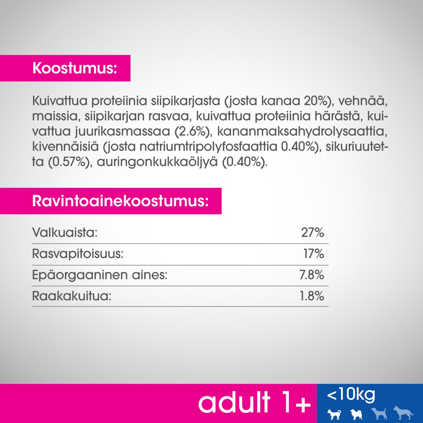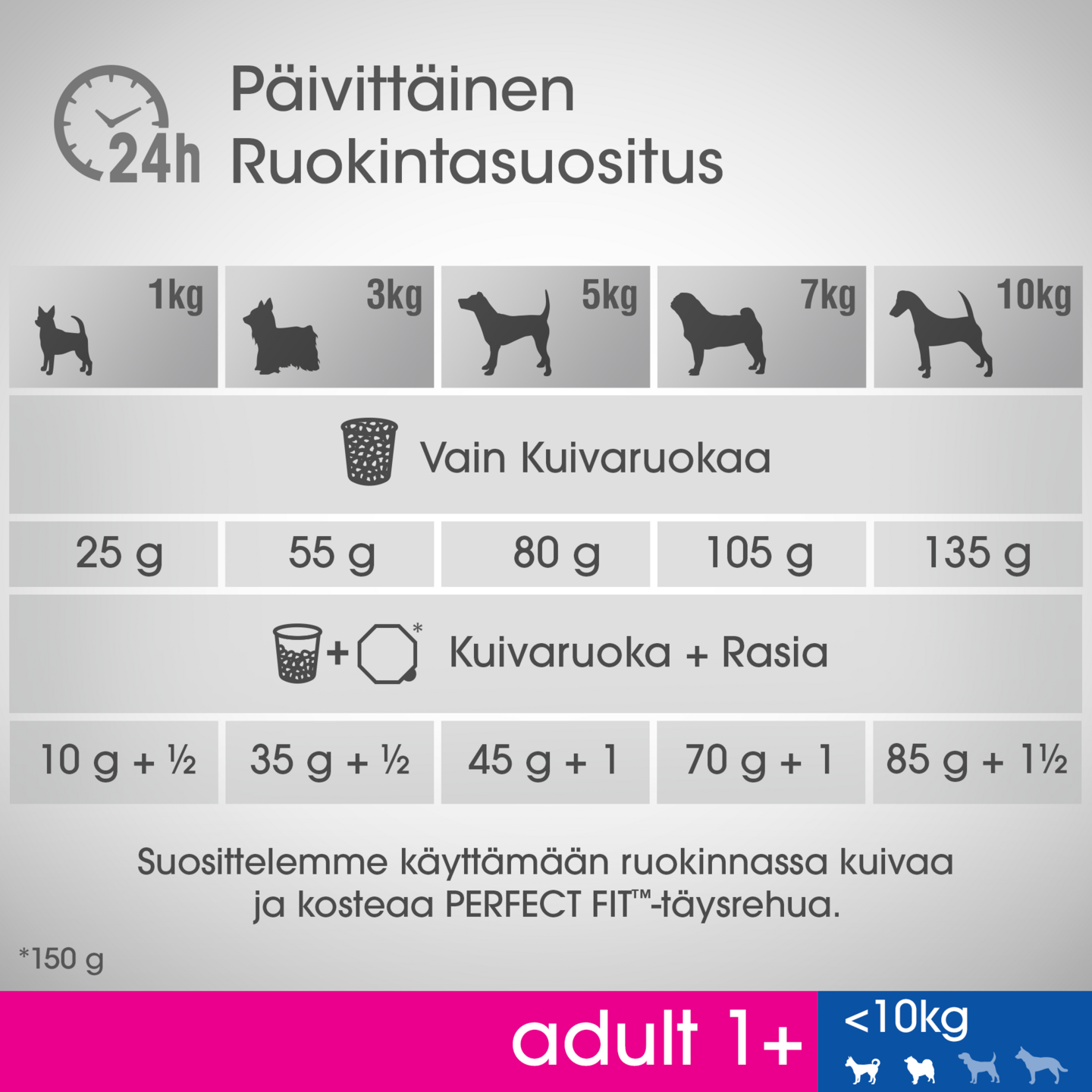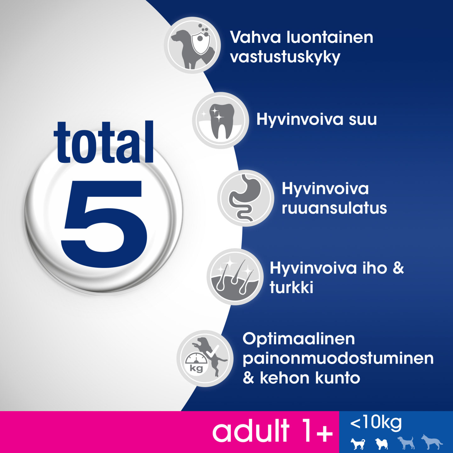 Perfect Fit™ Total 5 koostumuksen lisäksi, jokainen tuote valikoimassa sisältää lisäksi 3 terveyshyötyä, jotka on suunniteltu koirasi ravinnollisten tarpeiden mukaan. Tukee alempien virtsatiehyiden hyvinvointia Säädelty kivennäisaineiden koostumus tukee alempien virsatiehyiden hyvinvointia. Auttaa pysymään elinvoimaisena Sisältää B-vitamiinia ja rautaa, jotka auttavat pitämään koirasi elinvoimaisena. Mukautettu nappuloiden koko Pienempi nappulan koko on suunniteltu pienien koirien suuhun sopivaksi.