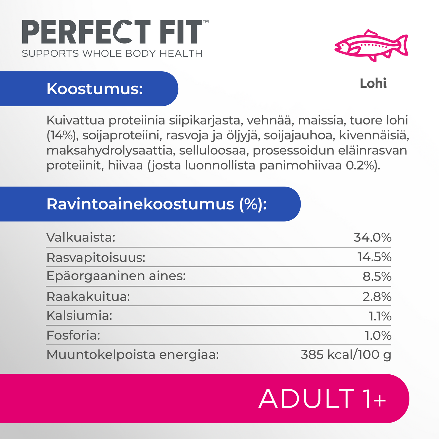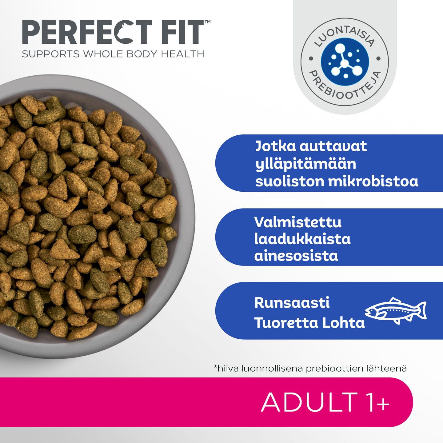 Ainutlaatuisen PERFECT FIT™ Total 5 -koostumuksen lisäksi Adult tuo tullessaan kolme täydentävää etua aikuisten kissojen erityistarpeisiin: Elinvoimaa ja liikkuvuutta - Kattava ja tasapainoinen ravinto tukee kissan elinvoimaa. Sisältää enemmän B-vitamiinia ja rautaa, jotka auttavat ylläpitämään kissasi liikkuvuutta. Hyvinvoivat ikenet ja hampaat - Rapea rakenne auttaa tunnetusti puhdistamaan hampaita, mikä on hyväksi ikenille. Vahvat lihakset - Korkea pitoisuus valittuja proteiineja tukee vahvojen lihasten kehittymistä.
