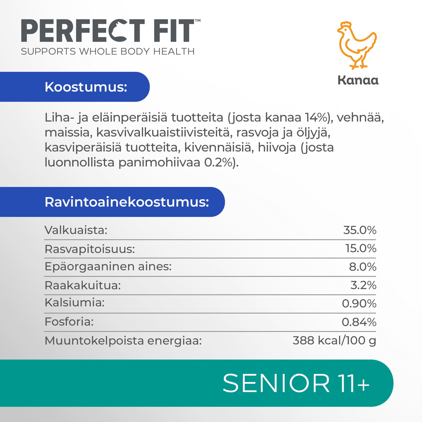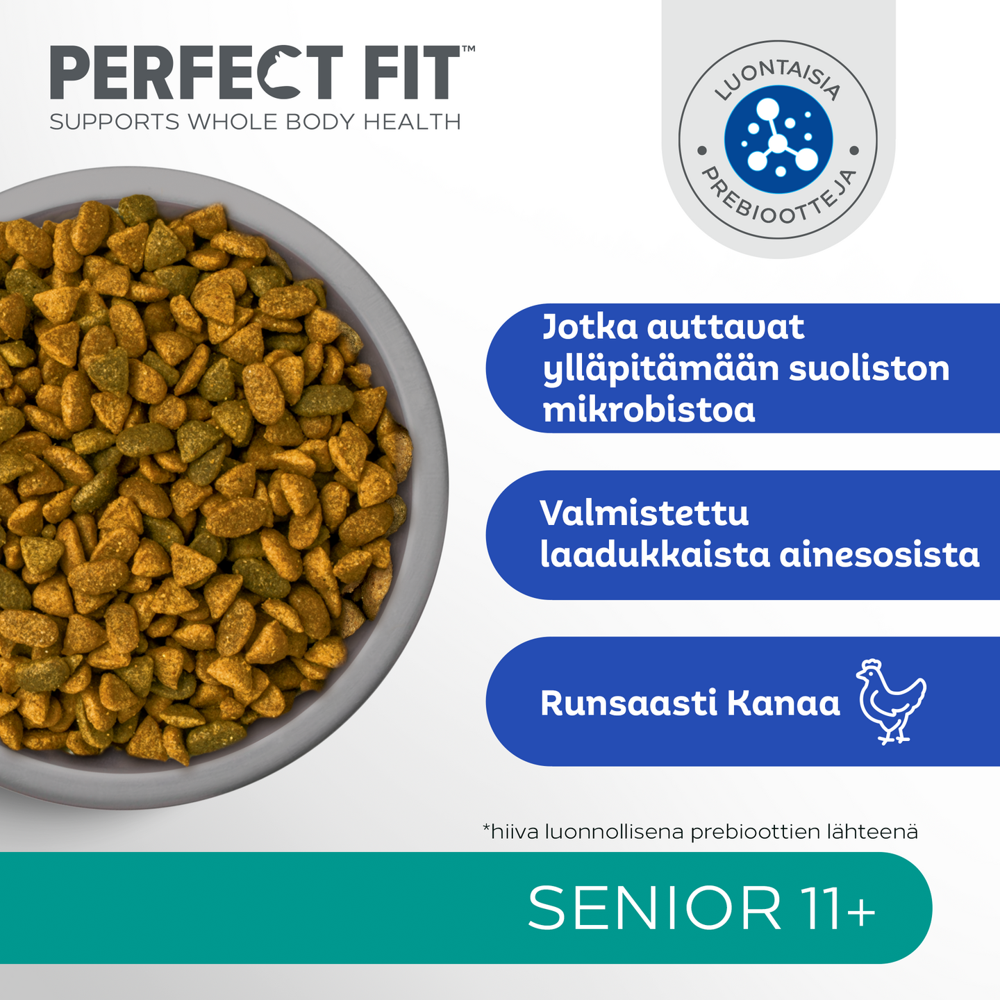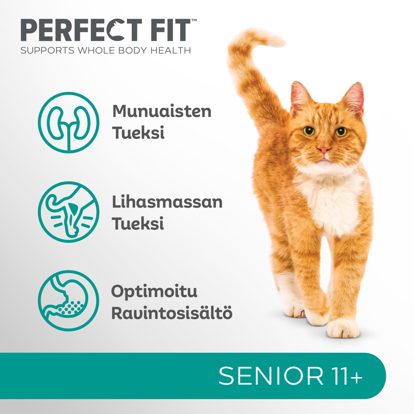 Ainutlaatuisen PERFECT FIT™ Total 5 -koostumuksen lisäksi kaikki tuotteemme tuovat tullessaan kolme täydentävää terveysetua kissasi erityistarpeisiin, joten se ravitaan varmasti oikein. Tuotteissamme käytetään laadukkaita proteiineja, joten voimme sanoa hyvällä omallatunnolla, että kissasi nauttii niistä! Munuaisten tueksi - Fosforin määrä on säädetty tukemaan ikääntyvien kissojen munuaisten hyvinvointia. Lihasmassan tueksi - Sisältää laadukkaita proteiinilähteitä ja tasapainoisesti energiaa, jotka auttavat ylläpitämään ikääntyvien 11+ kissojen lihasmassaa. Optimoitu ravintosisältö - Sisältää enemmän B-vitamiineja ja rasvaa kompensoimaan ikään liittyvää ravintoaineiden imeytymisen heikentymistä
