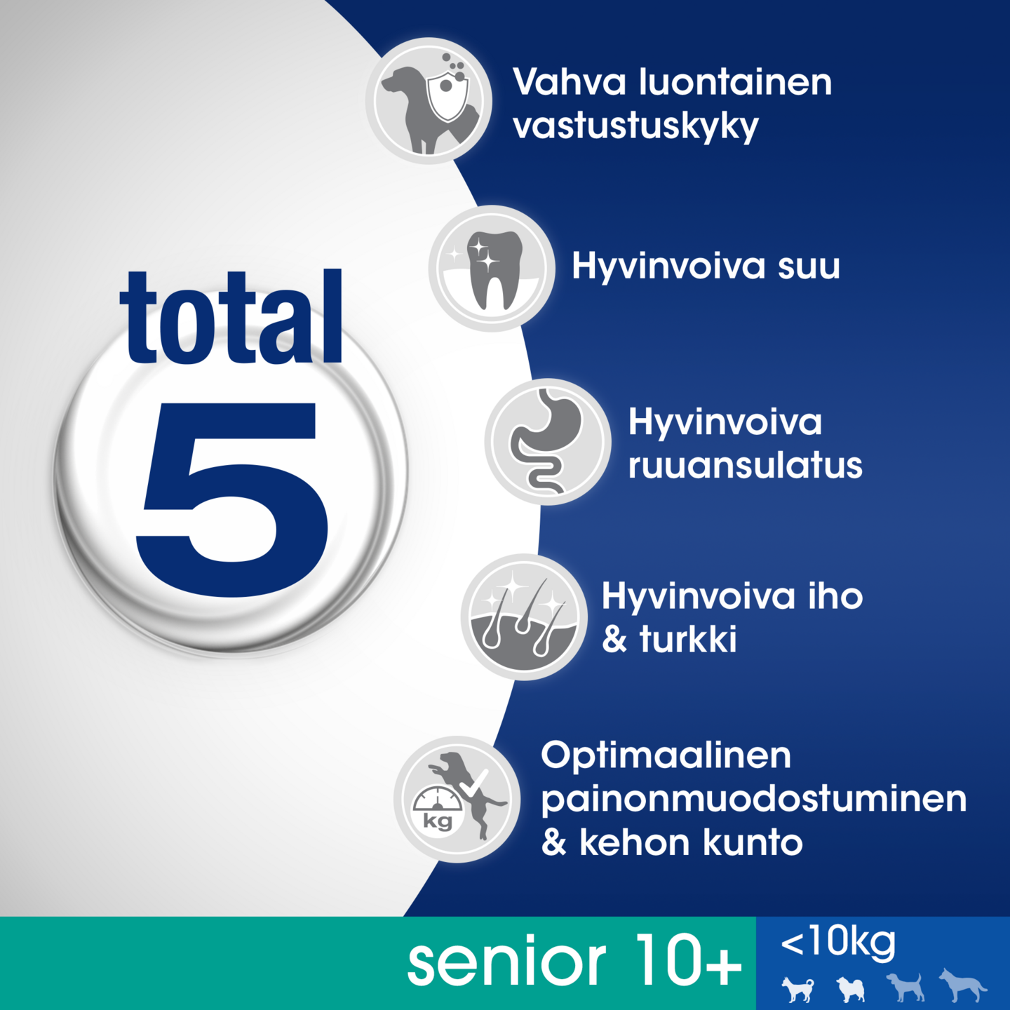 Perfect Fit™ Total 5 koostumuksen lisäksi, jokainen tuote valikoimassa sisältää lisäksi terveyshyötyjä, jotka on suunniteltu koirasi ravinnollisten tarpeiden mukaan. Tukee nivelten liikkuvuutta: Lisätty glukosamiinia, jonka tiedetään tukevan nivelten liikkuvuutta.