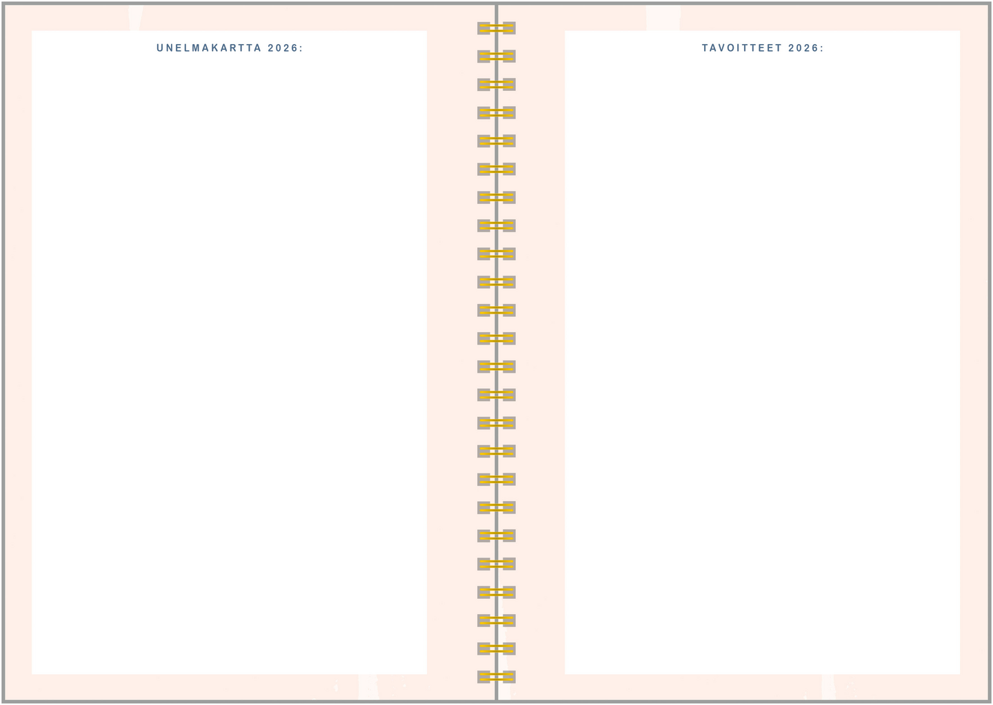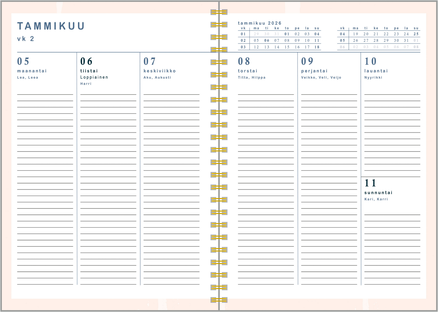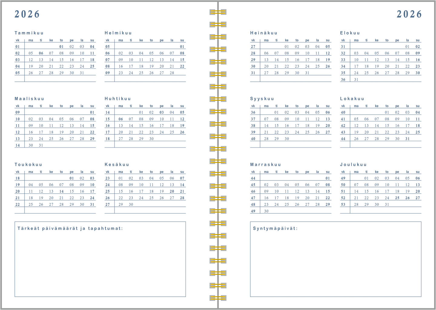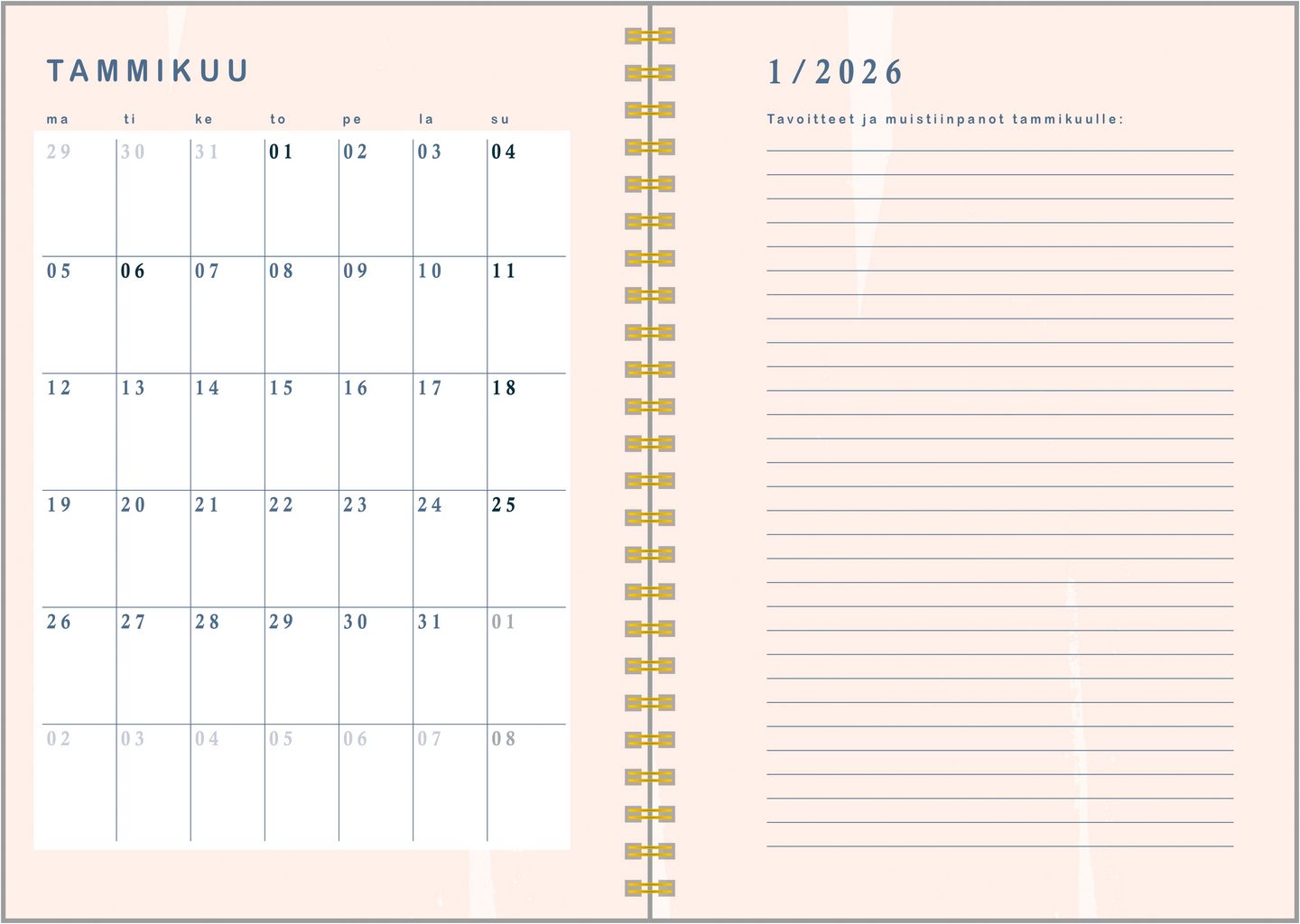 Trendikäs uutuus. Koko 148 x 210 mm (A5); parikierresidottu; kartonkikannet; aukeamalla selkeä viikkonäkymä; päiväkirja 1/2026 - 1/2027; liputuspäivät Suomessa; suomalaiset nimipäivät; runsaasti muistiinpanotilaa; joka kuukauden alussa tilaa tärkeille päivämäärille ja tavoitteille; FSC®-sertifioitu tuote.