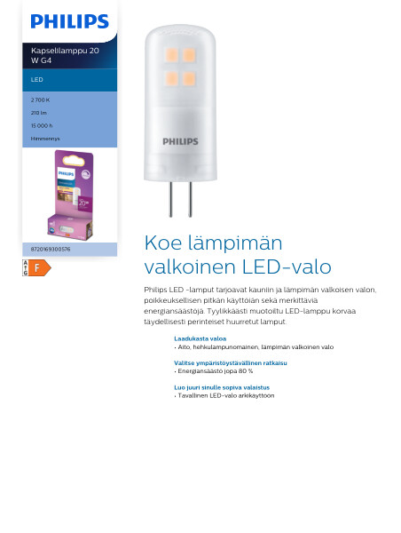 Philips LED -lamput tarjoavat kauniin ja lämpimän valkoisen valon, poikkeuksellisen pitkän käyttöiän sekä merkittäviä energiansäästöjä. Tyylikkäästi muotoiltu LED-lamppu korvaa täydellisesti perinteiset huurretut lamput. Philips LED kapselilamppu kanta G4, teho 2.1W, valovirta 210lm, värilämpötila 2700K, käyttöikä jopa 15000 tuntia, materiaali huurrettu muovi