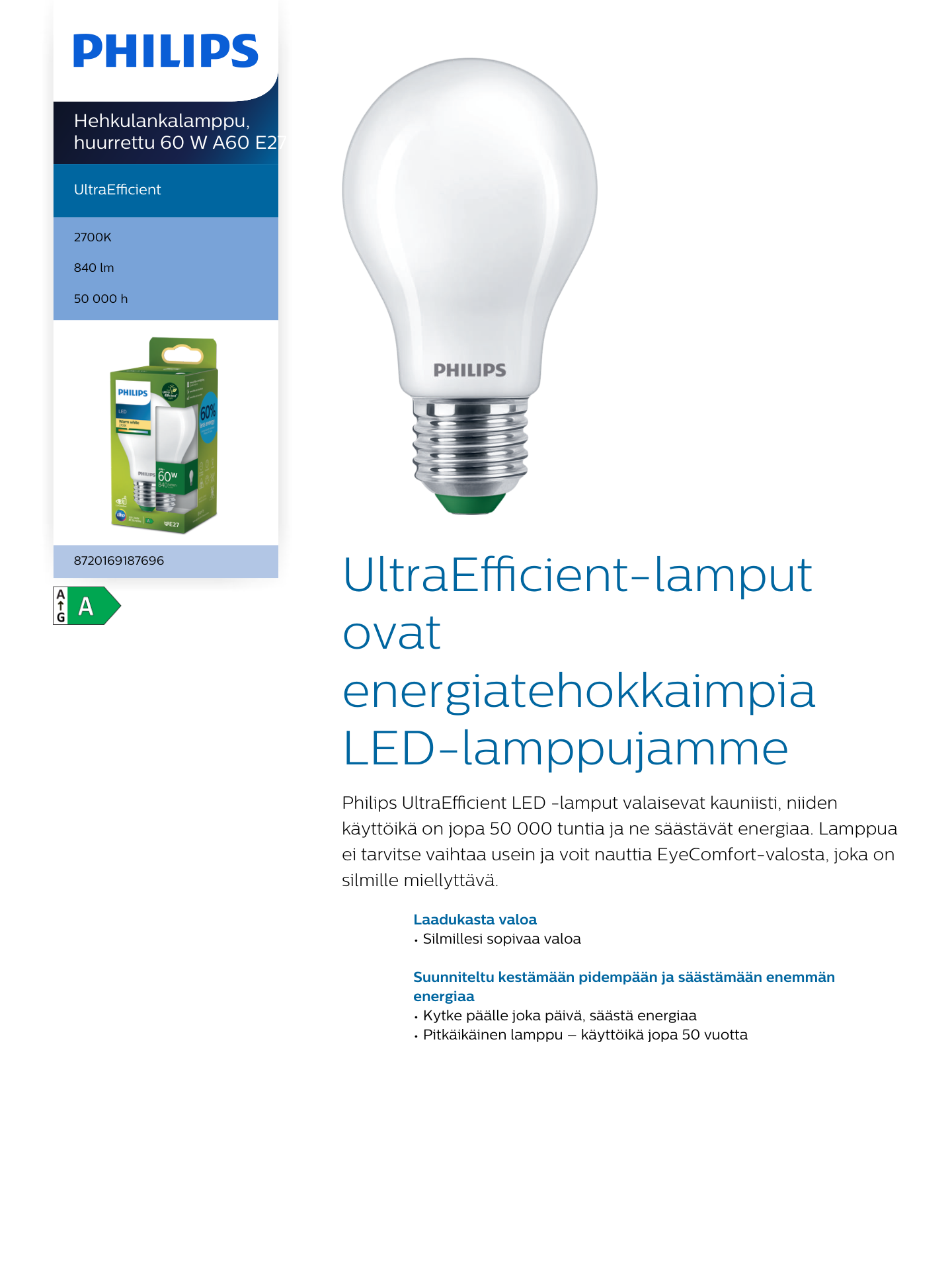 Philipsin LED-lampuilla luot helposti toimivan yleisvalaistuksen kotiin. Ratkaisu säästää energiaa heti asennuksesta alkaen, ja polttimoita tarvitsee vaihtaa entistä harvemmin. Ja mikä parasta, valaistuksen laatu pysyy ennallaan.