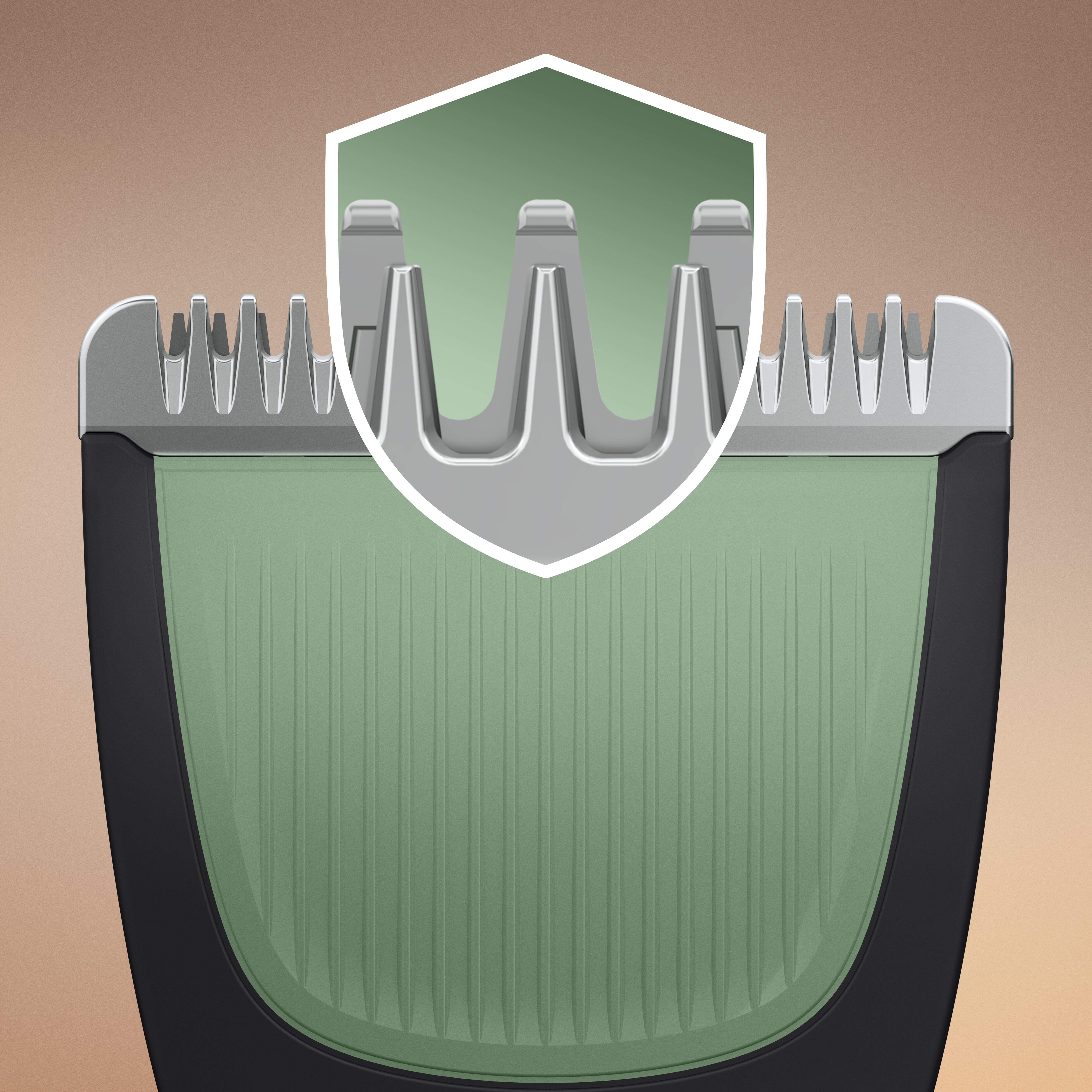 Ainutlaatuinen pyöristetyillä päillä varustettu terätekniikka on hellävarainen iholle ja takaa miellyttävän trimmauskokemuksen.
