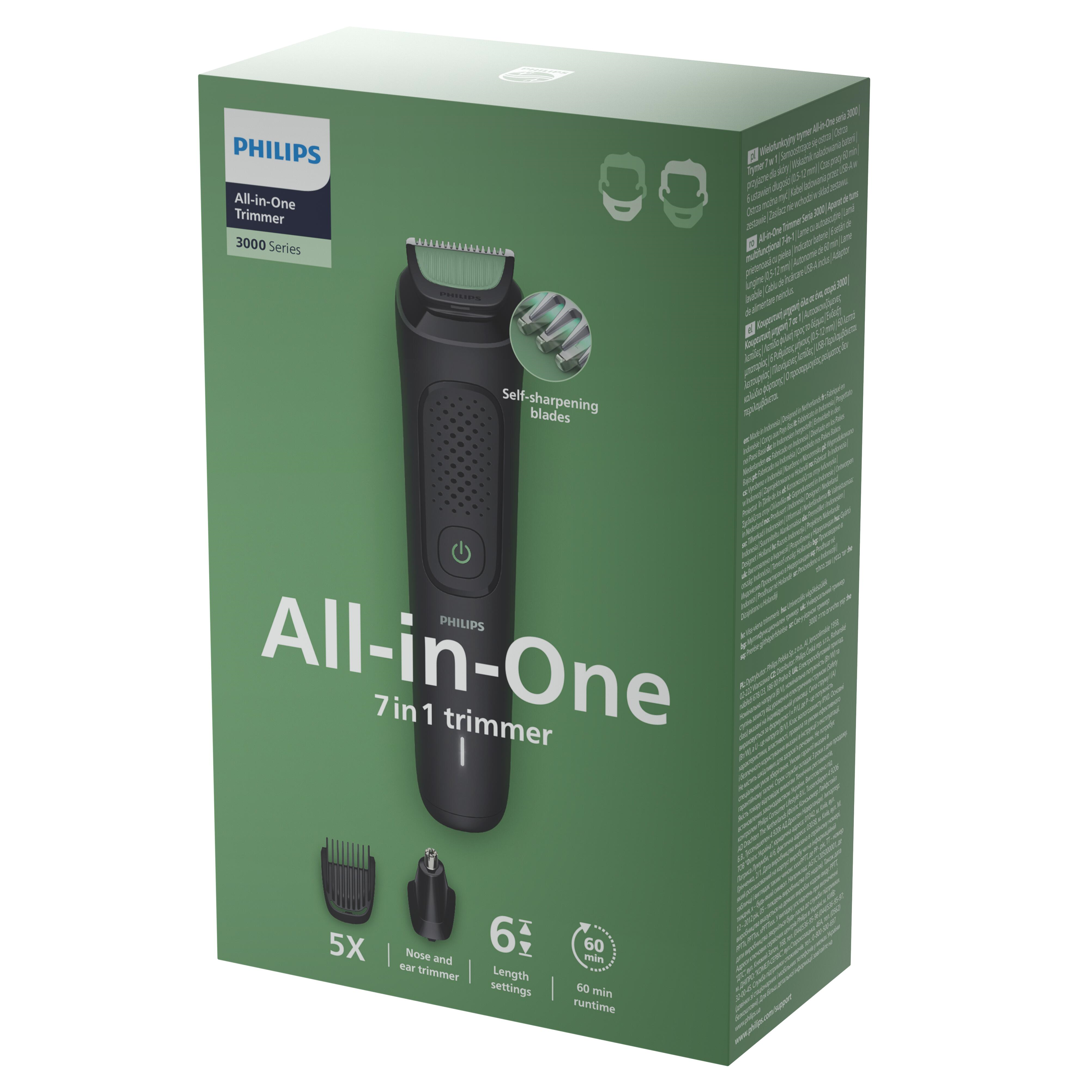 • Kuusi lisäosaa: Sänkikampa 1 mm, partakammat 3 mm, 5 mm, 7 mm, kampa hiuksille 12 mm, sekä nenäkarvatrimmeri