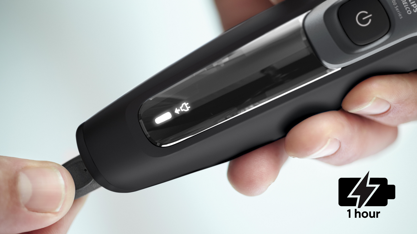Philips-parranajokoneen tehokkaan ja energiaa säästävän litiumioniakun voi ladata täyteen vain tunnissa. Onko kiire? Lataa parranajokonetta viisi minuuttia, niin virta riittää yhteen parranajoon.