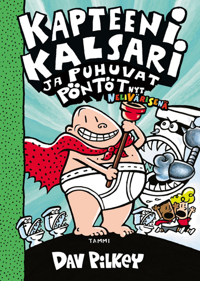 Kapteeni Kalsari ja puhuvat pöntöt nyt nelivärisenä! Koululaishuumoria parhaimmillaan.Erno ja Huuko ovat jälleen vauhdissa: Jerome Hurvitsin ala-asteen keksintökilpailut yllättävät jopa kaiken kokeneen rehtori Krupin ja hän määrää pojat jatkuvaan jälki-istuntoon vuoden loppuun saakka!Pojat kaivavat kynät ja paperit esiin ja keksivät suosikkisupersankarilleen upouuden seikkailun. Seikkailun nimi on Kapteeni Kalsari ja Puhuvat pöntöt. Mutta mitä tapahtuu, kun pojat ottavat sarjiksestaan kopioita TAHVO 2000 –kopiokoneella? Keksintökilpailujen seurauksena sillä nimittäin saakin eläviä, kolmiulotteisia kopioita! Ja tietysti rehtori Kruppi joutuu taas hypnoosiin, kun joku napsauttaa sormiaan, ja muuttuu itse Kapteeni Kalsariksi, ilmojen sankariksi.Lukeminen antaa supervoimia! Dav Pilkeyn avulla miljoonat lapset ovat löytäneet lukeisen riemun. Publishers Weekly -lehti valitsi Dav Pilkeyn vuoden 2019 henkilöksi ja kirjoitti, että Pilkey tekee eniten lasten lukuinnostuksen lisäämiseksi sitten J. K. Rowlingin.