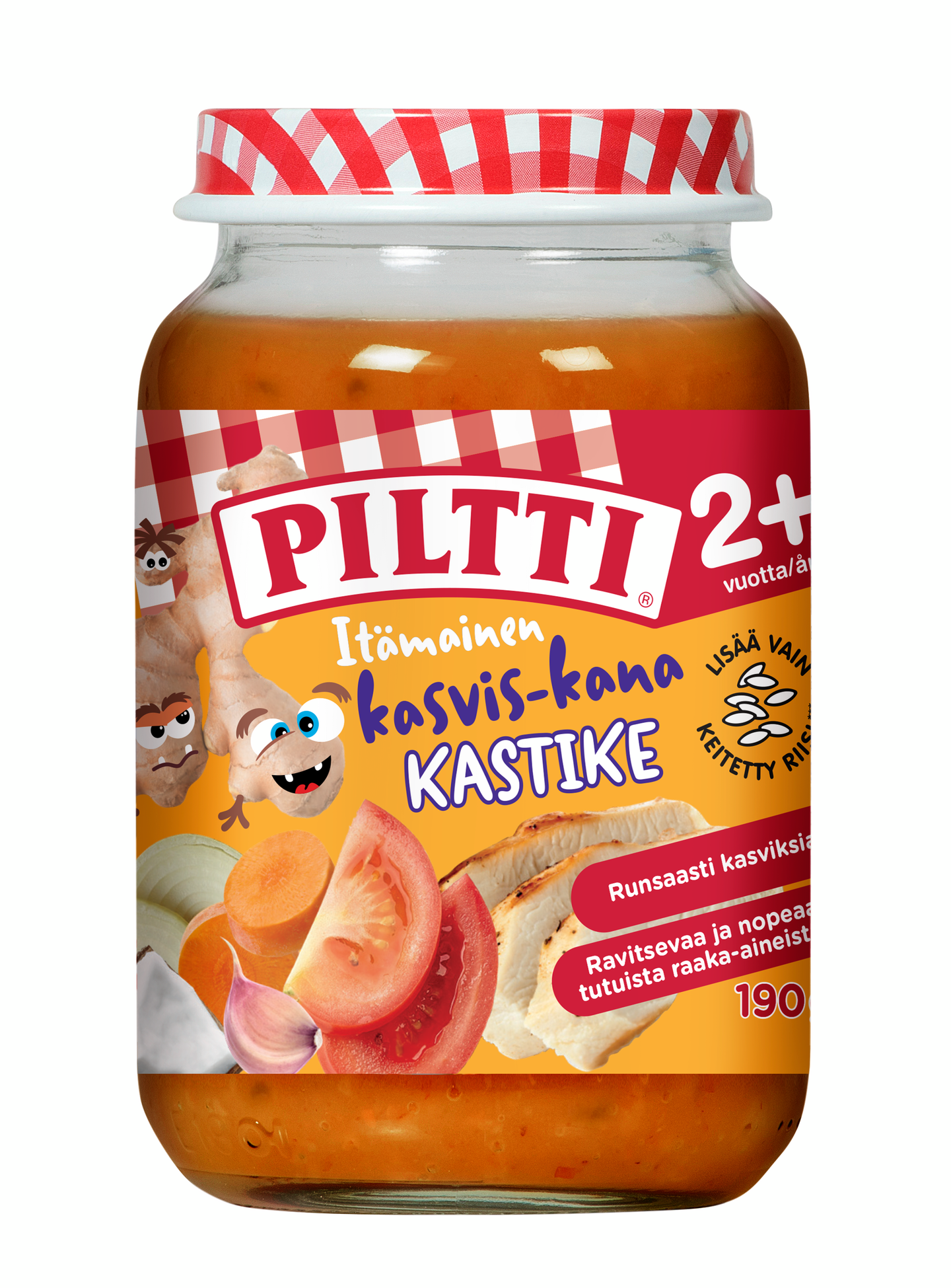 Nyt on maukas ja ravitseva ruuanlaitto lapsellesi vaivatonta. Piltin Itämainen kasvis-kana kastike on täysin uudenlainen arjen helpotus lapsiperheille, joissa on jo 2 -vuotiaita lapsia. Itämaisen kasvis-kana kastikkeen avulla helpotat arkeasi ja samalla voit huoletta tarjoilla maistuvan sekä eksoottisemman makuelämyksen pikkuisellesi. Kastikkeen avulla pystyt vaivatta tarjoamaan kasviksia lapsellesi maukkaalla tavalla. Maku on saanut inspiraationsa itämaisesta ja intialaisesta keittiöstä. Siinä on käytetty runsaasti tuttuja kasviksia sekä lihana miedon makuista kanaa. Eksoottisen maun tuo juuri sopiva määrä inkivääriä ja muita mausteita. Täyteläisyyttä makuun tuo kookoskerma. Kastikkeemme on taattua Piltti-laatua ja suomalaista työtä pullollaan! Olemme kehittäneet reseptin suomalaisten ammattilaisten osaamisella Suomessa. Valmistamme kastikkeemme Turun lastenruokatehtaallamme pitkäaikaisella osaamisellamme. Lapset aina loppupelissä päättävät makuasioista, ja siitä syystä Piltti Makuraati on testannut ja myös hyväksynyt kastikkeen maun. Kuten kaikki Piltti-tuotteeme, tässäkin kastikkeessa olemme käytäneet ainoastaan korkealaatuisia, huolella valittuja lastenruokalaatuisia raaka-aineita, ja se on läpäissyt tiukimmat laatutarkistuksemme. Kastike on kehitetty pienten lasten tarpeisiin suomalaisen lastenruokalainsäädännön mukaisesti, ja siksi se on vähäsuolainen sekä sisältää juuri oikeassa suhteessa eri ravintoaineita. Keitä riisi, lämmitä Piltin kastike ja tarjoile. Pikkuisesi makumatka itämaiseen keittiöön voi alkaa ! Lue lisää tuotteesta, käyttöideoista sekä tutustu muihin kastike-sarjan tuotteisiin www.piltti.fi/tuotteet.