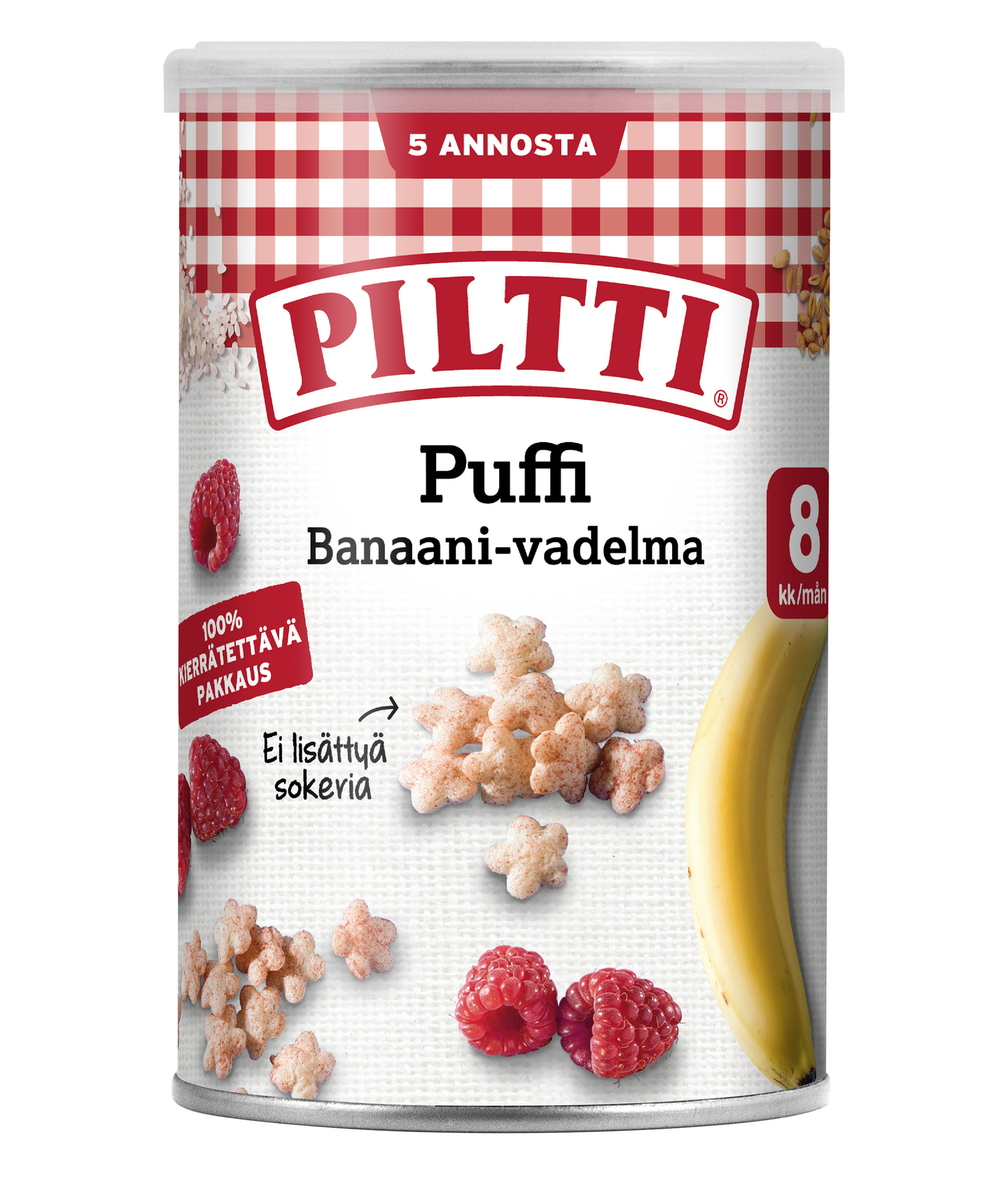 Piltti Puffit ovat banaanin ja vadelman makuisia, lasten tarpeisiin suunniteltuja riisi-ja vehnänaksuja, joka on helppo poimia pienillä sormilla! Puffit on tehty lastenruokalaatuisista aineksista, ja ne sulavat helposti lapsen suussa. Puffit sisältävät kuivattuja hedelmiä, eivätkä lainkaan lisättyä sokeria. Sopii lapsille 8 kuukaudesta alkaen. Huomaathan, että tuote saattaa sisältää maapähkinää ja pähkinää.